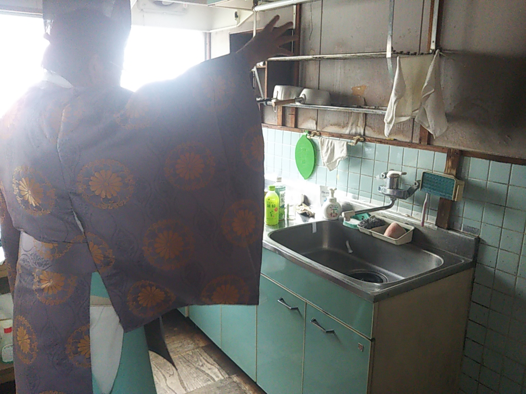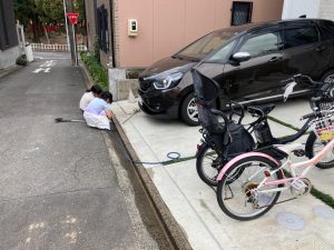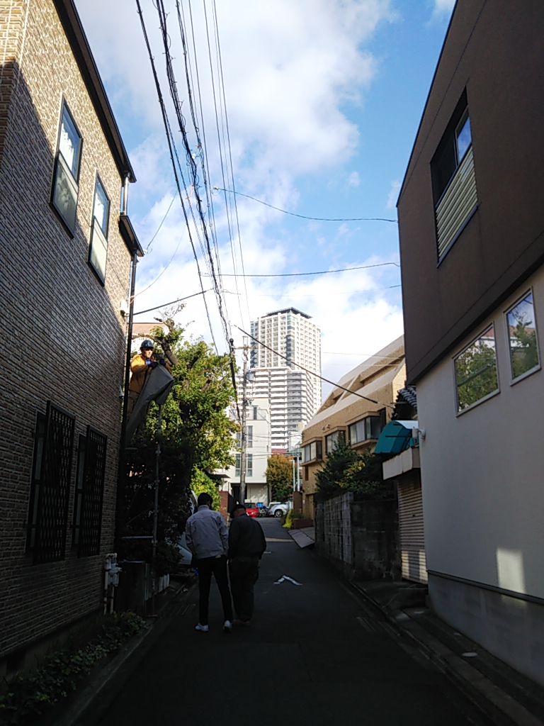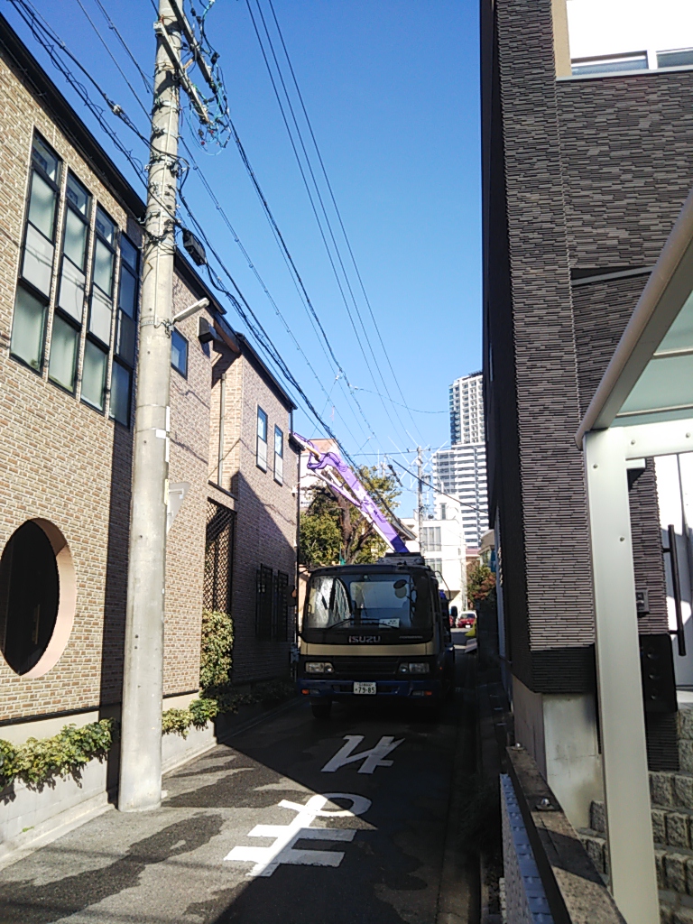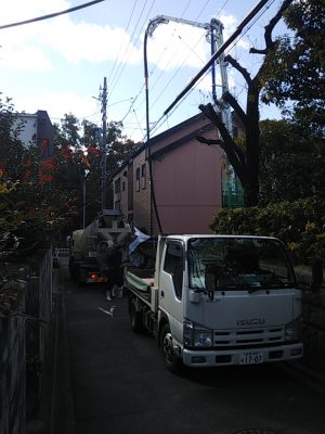 しかしこの水道業者さん二人で2台のトラックに分乗してきたのですが、この狭小の間口に2台ぎりぎりで並べて駐車する、という荒業を展開してます。よく入ったな。