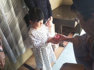 最後に玄関の部分をお祓いとお清めをして完了です。お供え物からのお下がり物として果物を一つお渡しされました。