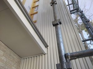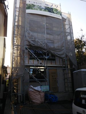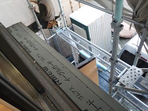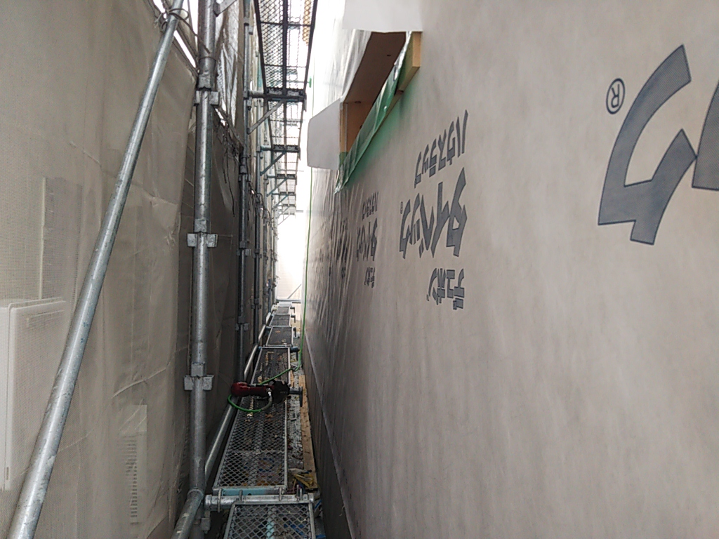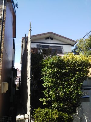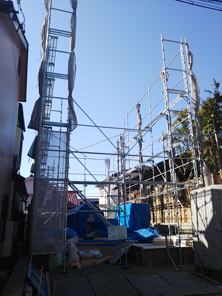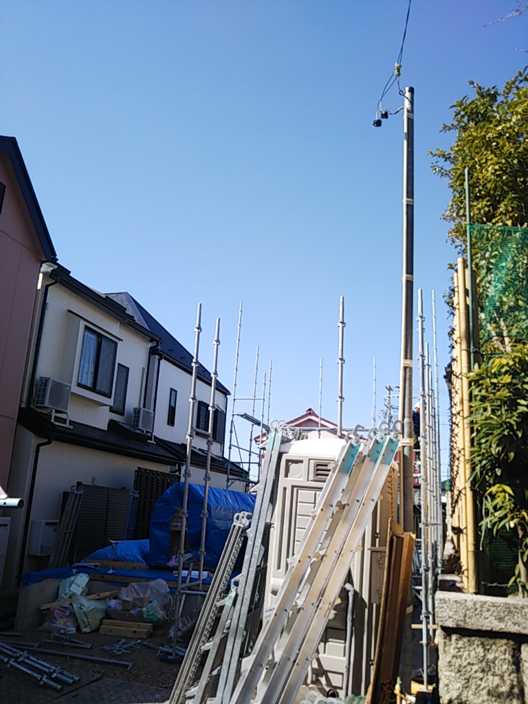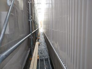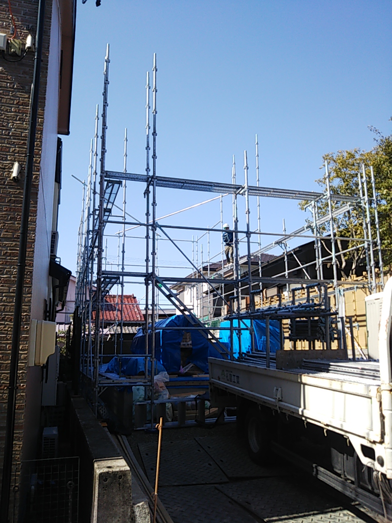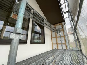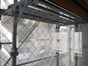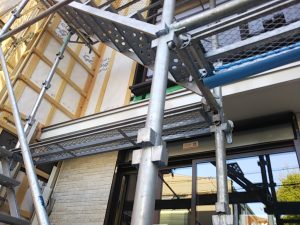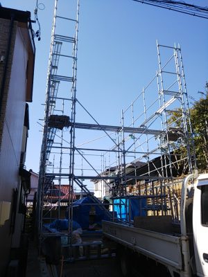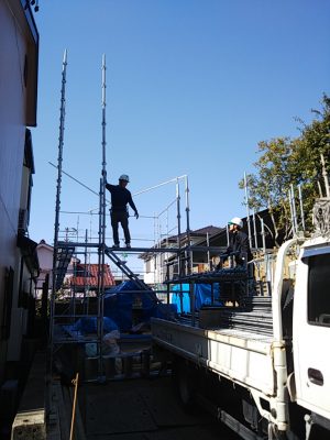 先行足場組作業を行います。本体の住宅に対する近隣へのガードの役目を果たしますが、足場組作業の時のガードは何もないため、見ていてヒヤヒヤする作業です。足場も結構不安定。筆者は高所恐怖症のためできません。
