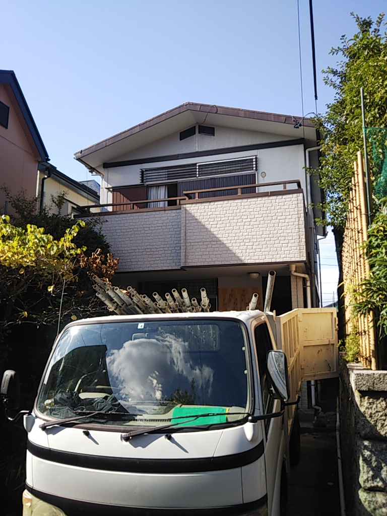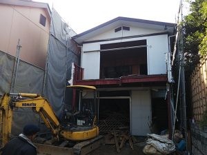 いよいよ解体工事がスタートしました。敷地、前面道路とも狭小なためなかなか引きで写真が撮れません。解体業者さんも2t車を駐車場にいれるのに一苦労です。近隣住宅も密集しているため、シート養生をして慎重に作業を進めます。