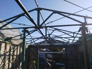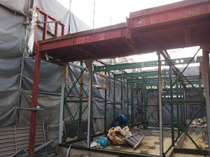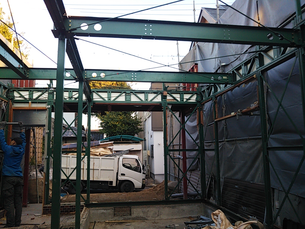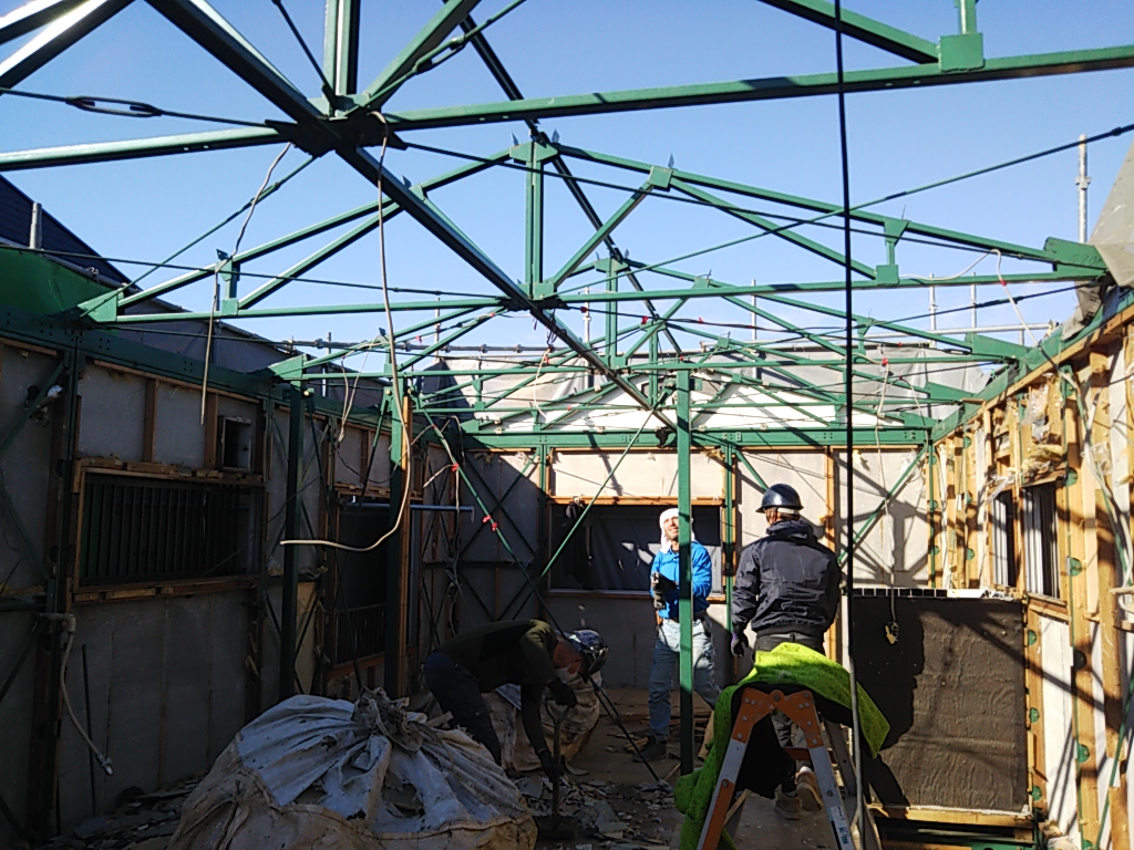 解体工事も滞りなく進み屋根が軽量鉄骨の骨組みのみになりました。今まで薄暗かった室内に陽の光がさんさんと照り付けます。気温が下がりだんだんと寒くなってきますので、日射がありがたい季節になってきました。