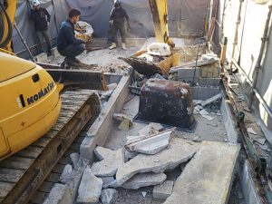 上部の構造がすっかり解体され、あとは基礎コンクリートを残すのみとなりました。ここでやっと重機を投入。コンクリートを割っていったり瓦礫を救い上げたりすると砂埃が舞い上がりますので、散水しながら撤去作業にかかります。