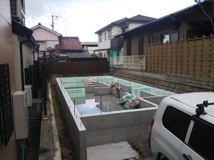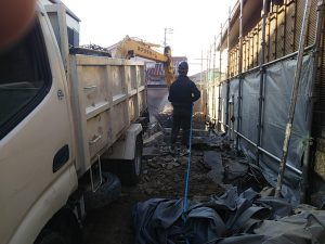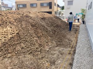 残土処理からスタート。坂道の途中にあるような現場ですので、写真向かって左のお隣様とは敷地に高低差があります。構造計算ではその部分は基礎を深く造る必要があるため、ここから更に土を深く掘っていきます。