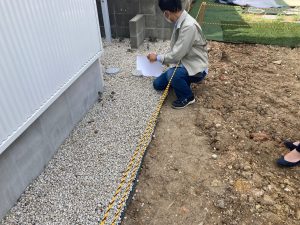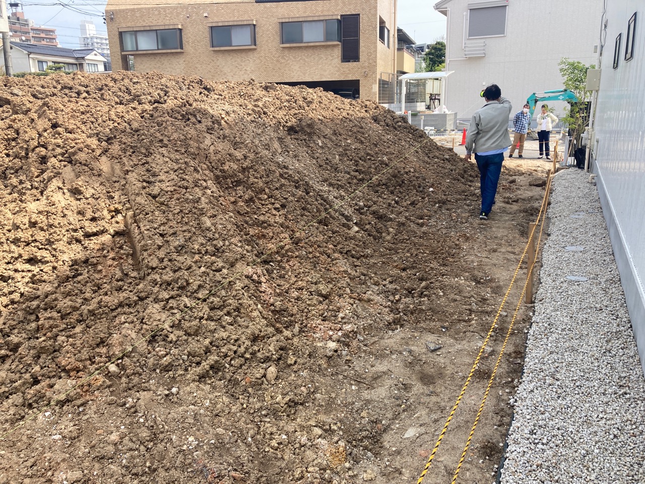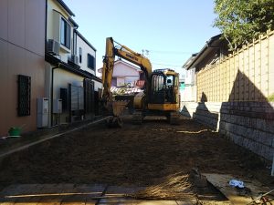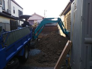 見学会の時点では未施工でしたが、外部駐車場の工事に入ります。まずは土間のコンクリートの厚みを確保するために余分な土を撤去します。