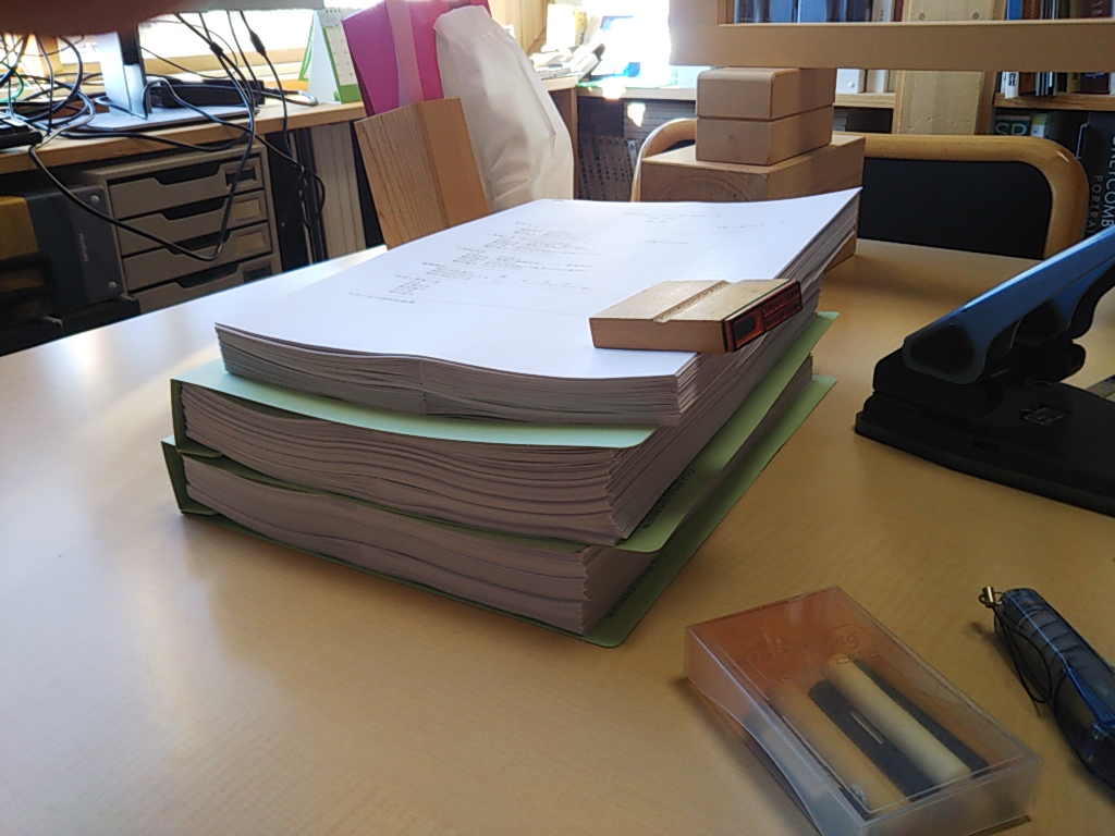 午後から申請図書提出に各部署を回りました。普段は木造2階建てばかりですので比較的書類は少ないのですが、今回は3階建てという事でこの偉容。準防火地域、準延焼防止建築物、木造3階建てにおける許容応力度計算などなど重ねていくとこのような大容量の書類となります。