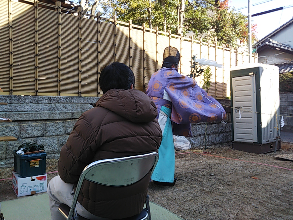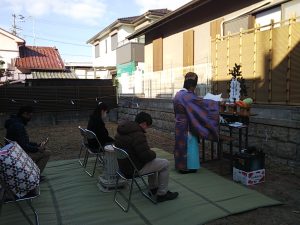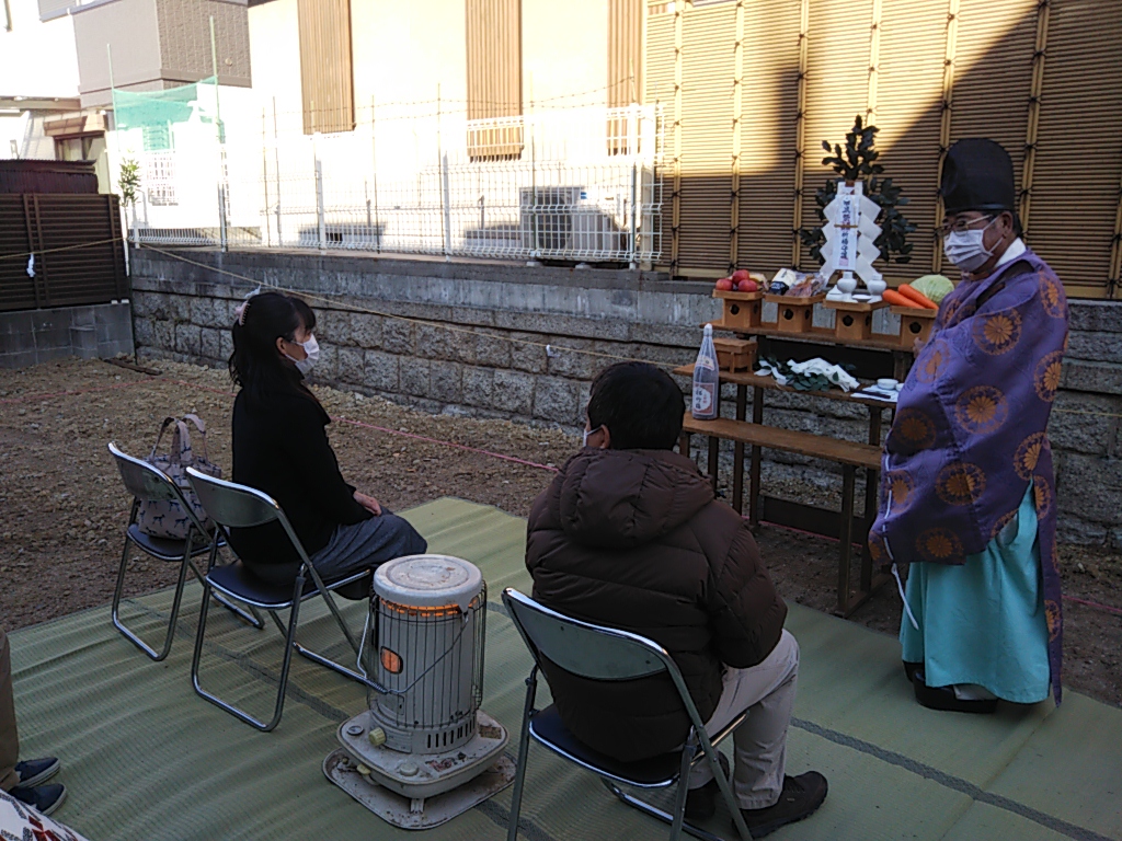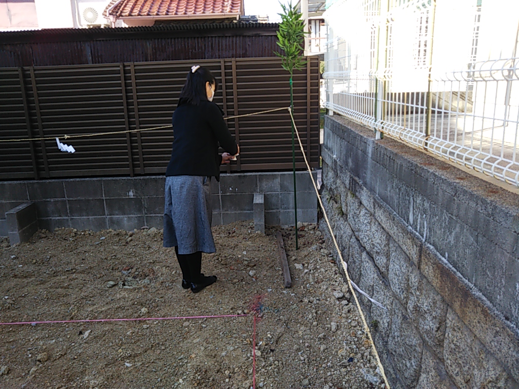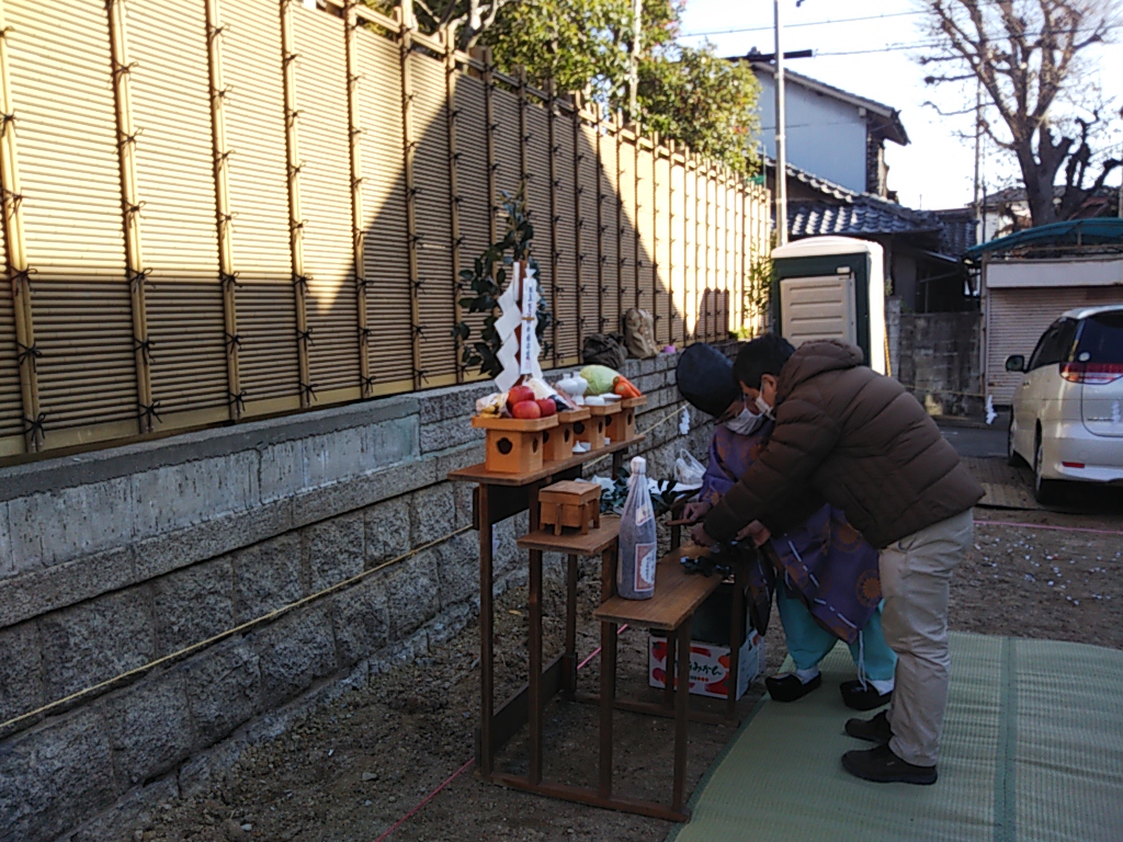 祝詞奏上、四方祓い、玉串奉奠、つつがなく終了。工事の安全、ご家族のご健勝を祈念して無事に地鎮祭を終えました。ご近隣にもごあいさつに回り、いよいよ年明けから工事開始です。