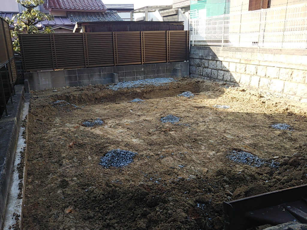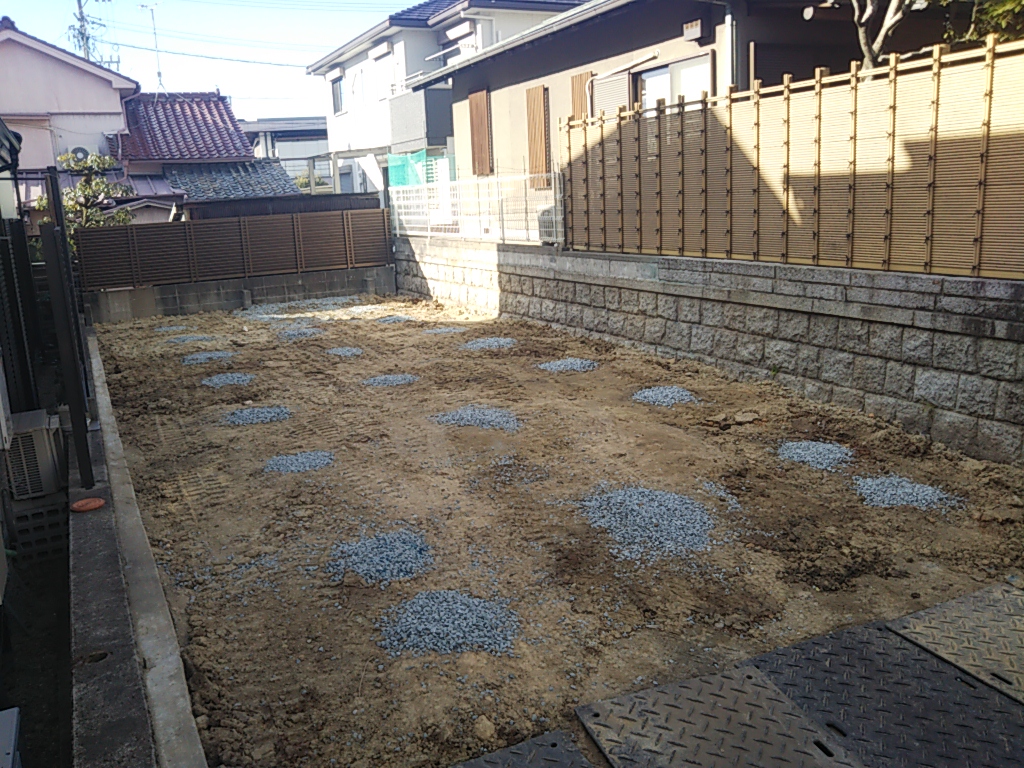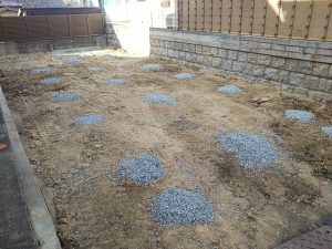 地盤改良工事が終了しました。表面にところどころ砂利が撒いてあるだけのように見えますが、『砕石パイル工法』という工法を使用しています。