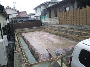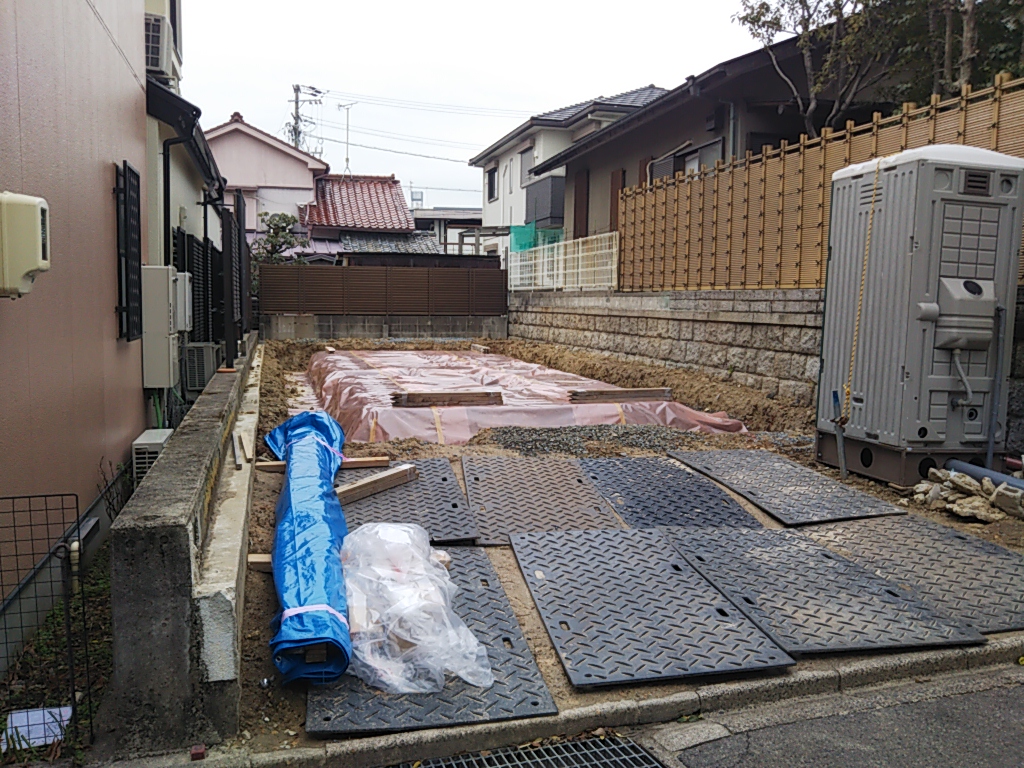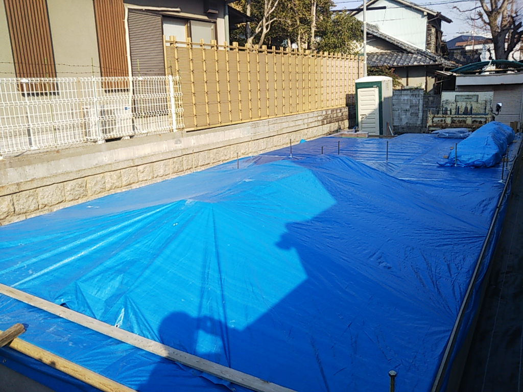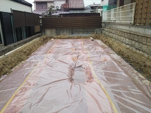 3階建てを支えるコンクリート基礎の形に敷地の土を掘削し終え、防湿シートを敷設した段階です。遺跡発掘調査の現場で土の保護のためにシートをかけてあるように見えますが、明日からいよいよ丁張りを始め、鉄筋の工事にかかっていき、一気に建築現場の様相を呈してきます。