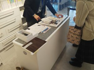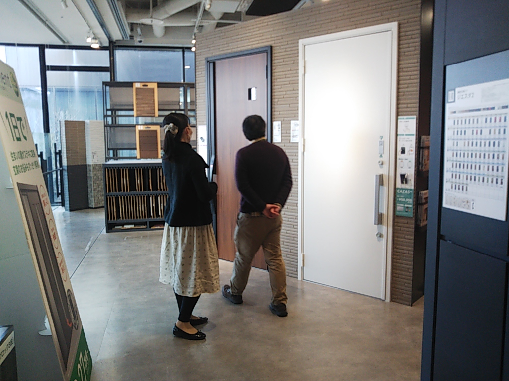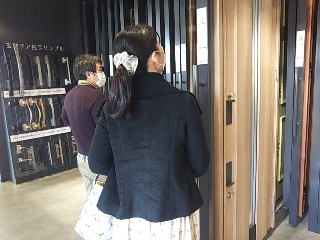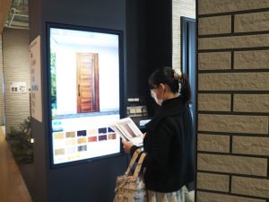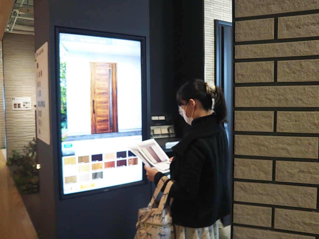 某L社の玄関ドアの実物を見学にショールームへやってきました。玄関は家の顔となります。やはりこれだけのサンプルを目の前に大いに迷うところです。タッチ画面でカラーシミュレーションできるシステムもあり、色柄を決定する事ができました。