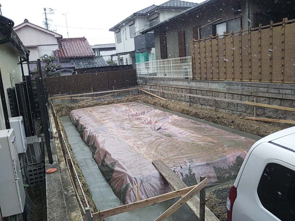 現場では鉄筋を施工する前の捨てコンクリートが打設されました。地面に直線を引くため、上面を平滑に均したコンクリートです。基礎の職人は今日に限って雪の降りしきる中凍えながら作業をしてもらいしました。