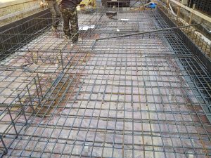 駐車場の工事。土間コンクリートを打設するための型枠とメッシュ筋の配置が終わりました。