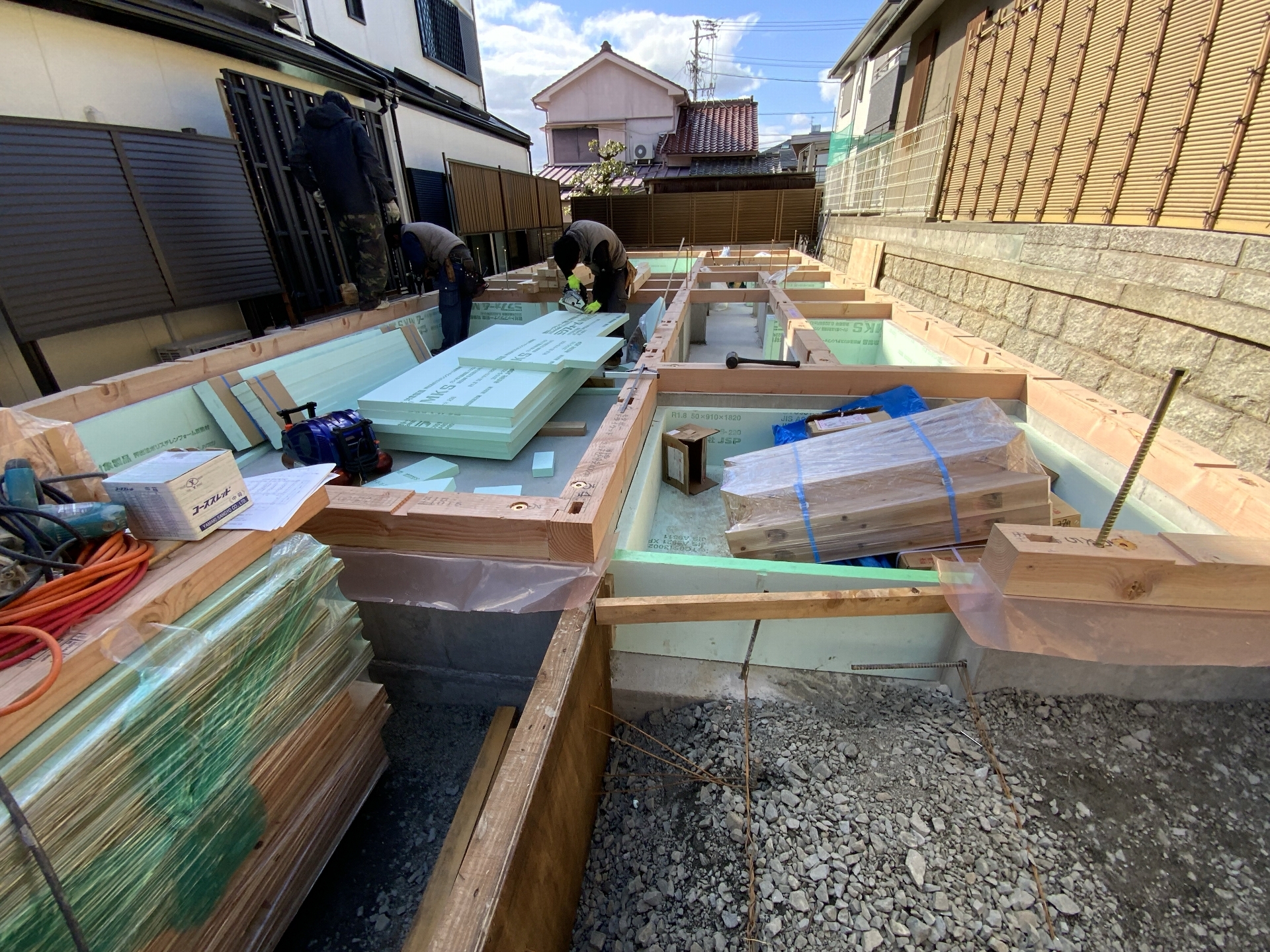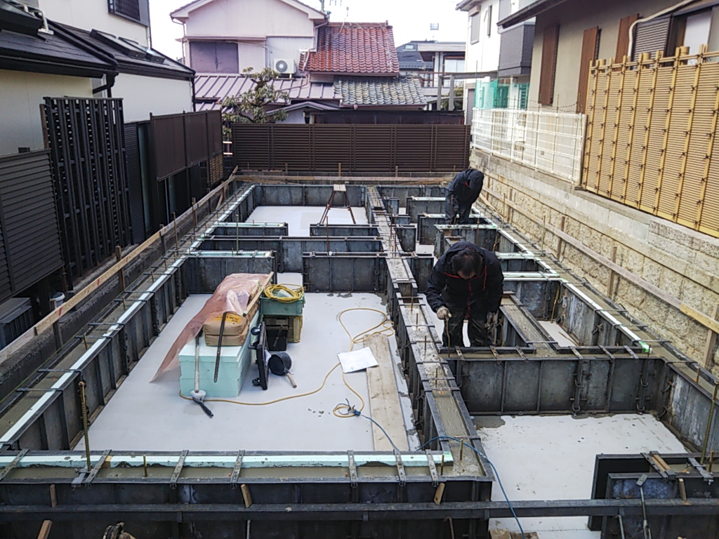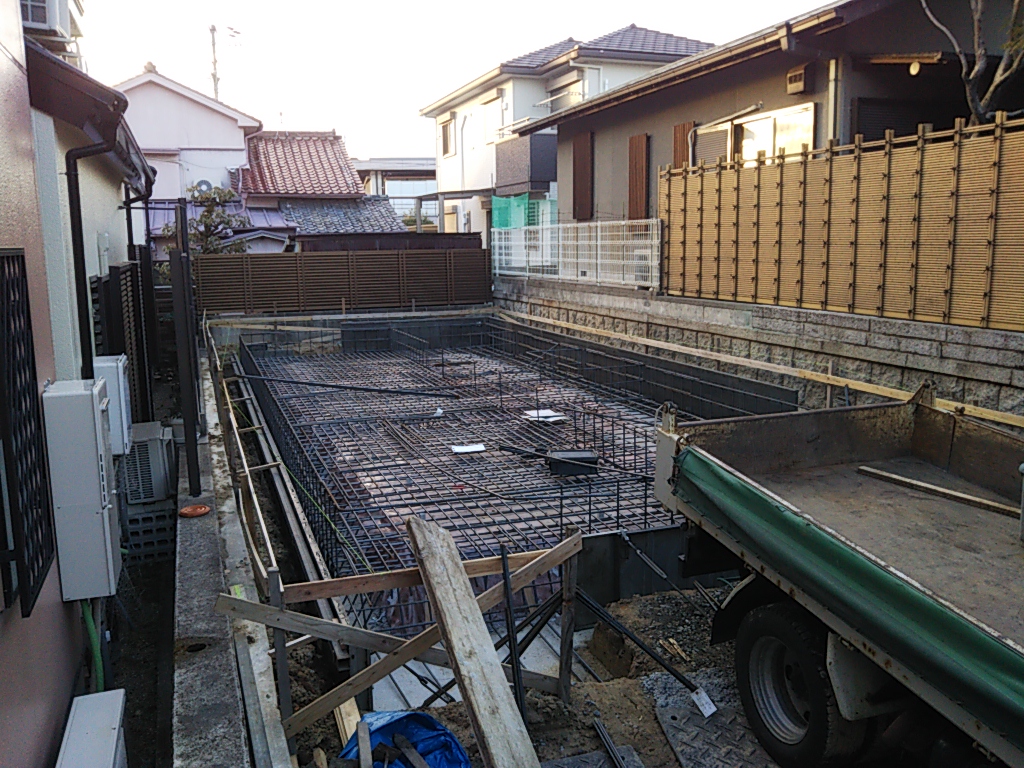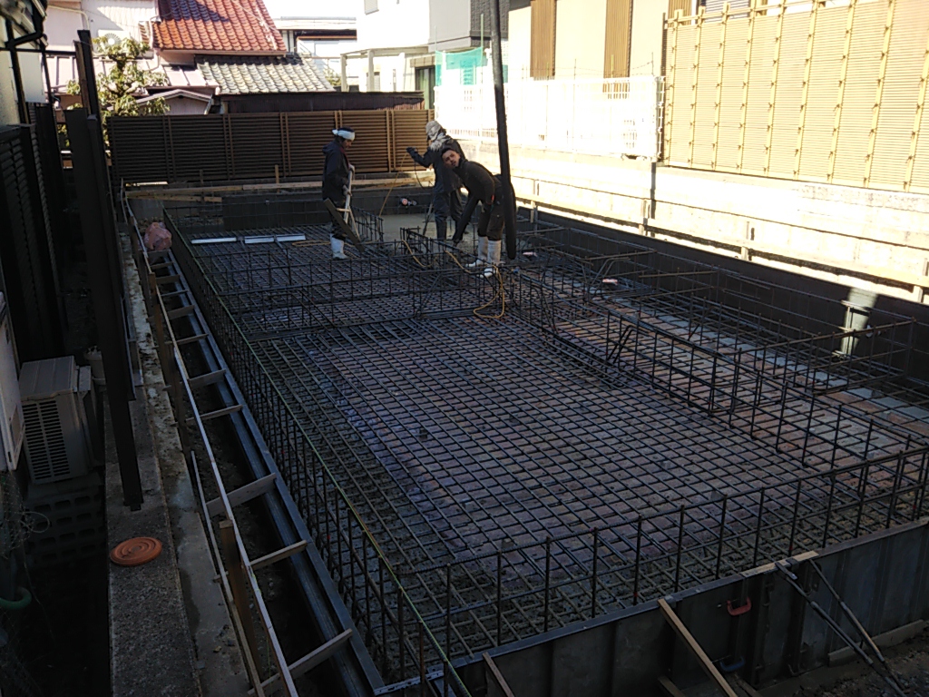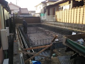 基礎配筋工事が始まりました。今回の基礎は3階建てであり、許容応力度計算で計上されているため、普段とは違う組み方をしている部分があり、現場の職人さんも知恵を絞りながらの組立となります。しかしながらこのスピード、明日は順調に配筋検査ができそうです。