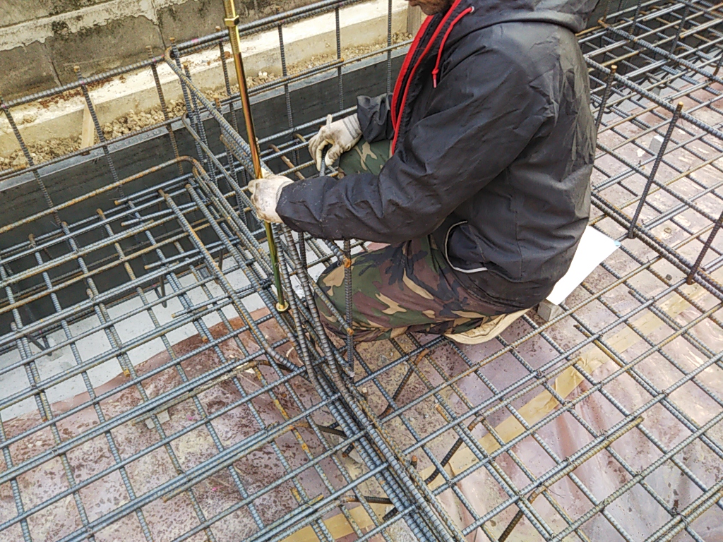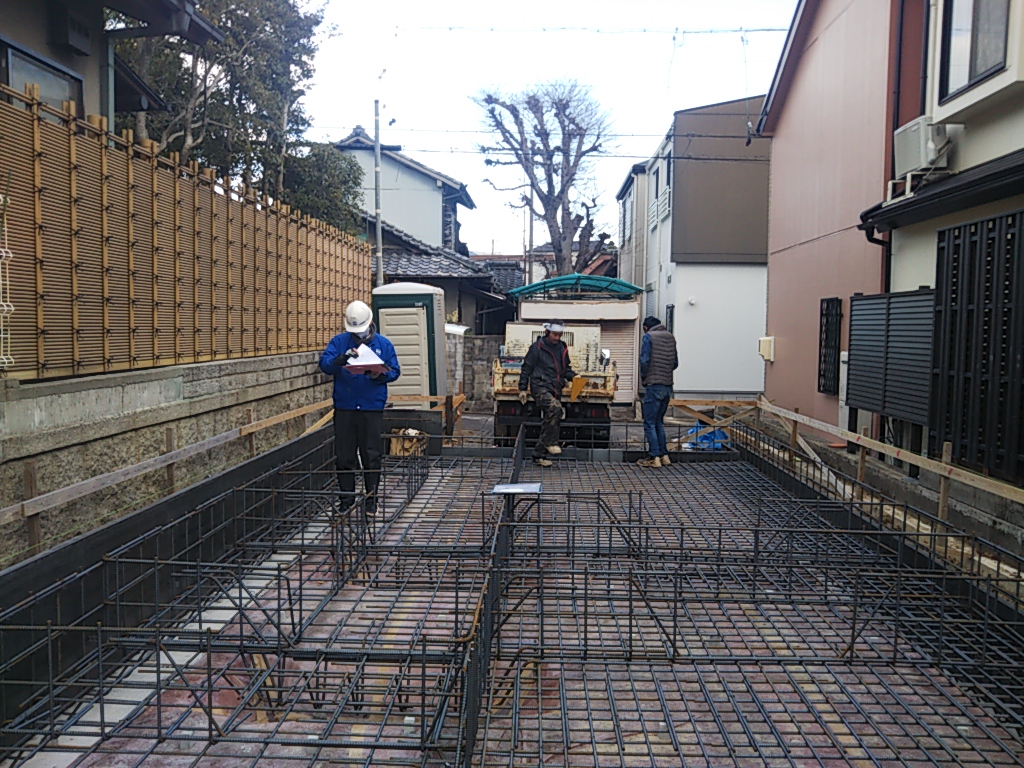 配筋の自主検査にやってきました。と同時にJIO(日本住宅保証機構)による監査を受けました。ミノワではJIOの講習を受講することによって基礎の配筋検査は自社で行うようにしていますが、何物件かに一回こうしてJIOの検査員による監査を受けています。すなわち『自主検査員の検査員』。(きちっと検査しているか、という事のチェックを受けます)さすがに本職の検査員は見る目がキビシイ。さらには今回は許容応力度計算によって普段と違う基礎配筋方法をとっていますので、自主検査を行う筆者も緊張と緩和の連続です。