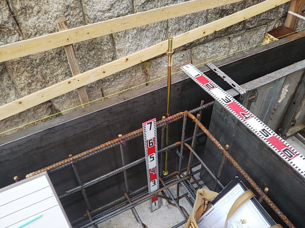 何とか無事に監査を終えほっと一息、ホールダウンアンカーボルトの位置確認を行いました。こちらも計算の結果、普段は使わないようなかなりゴツイボルトを使用することになっています。