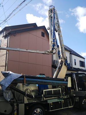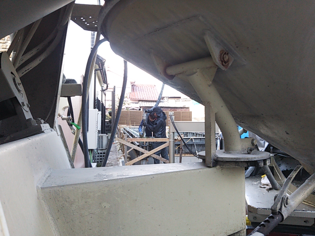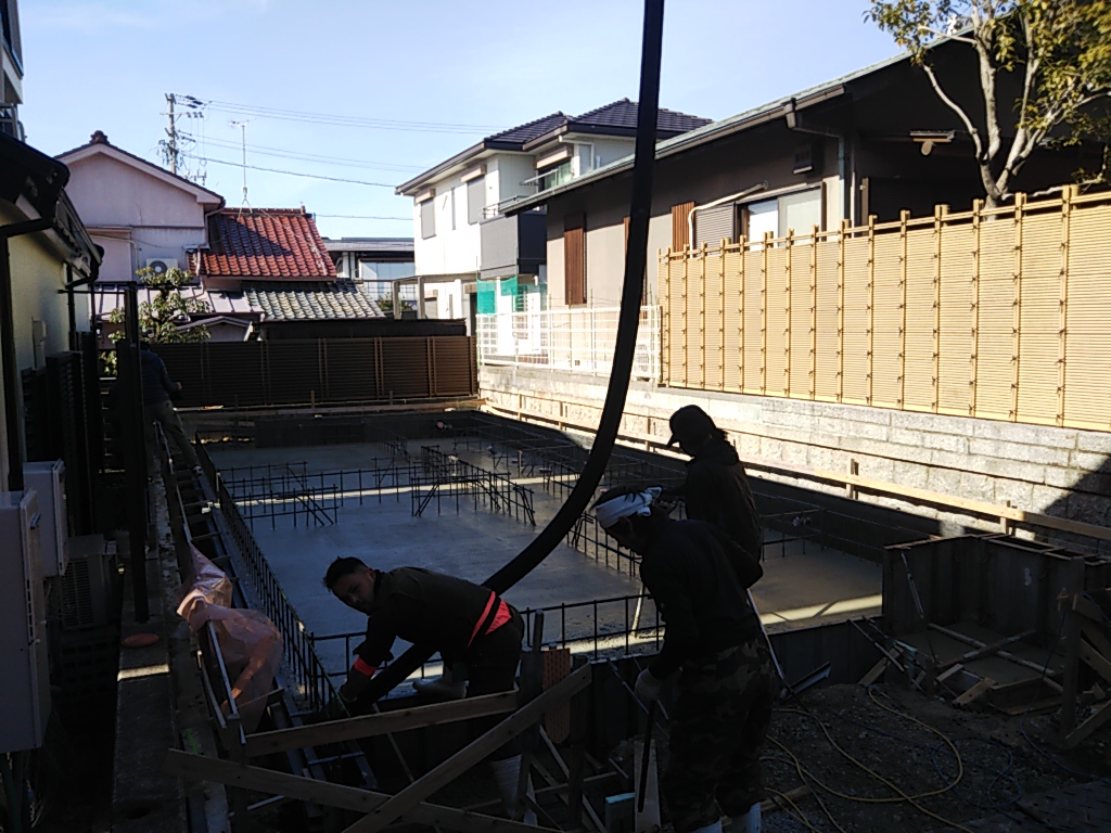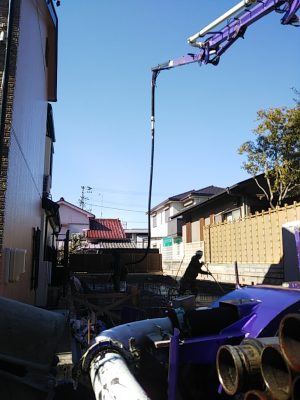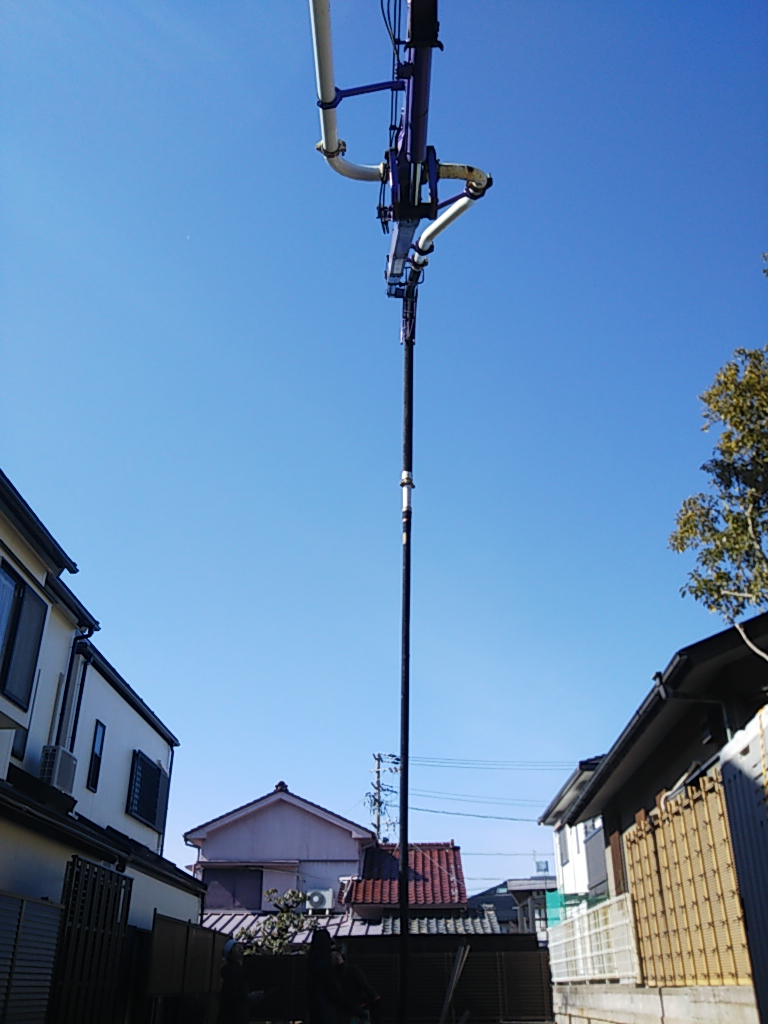 基礎の底板コンクリート打設工事です。狭小地、狭小道路につき、所轄の警察署で道路使用許可を取り、ご近所の方に事前告知をして道路にポンプ車、アジテーターを駐車して(我が物顔で)打設を行います。現場監督と二人で、道路の両端でガードマンをしつつ、打設が進むのを逐次観察。ポンプ車の運転手さんもブームが電線に触れないように細心の注意を払ってマシンを作動させます。
