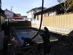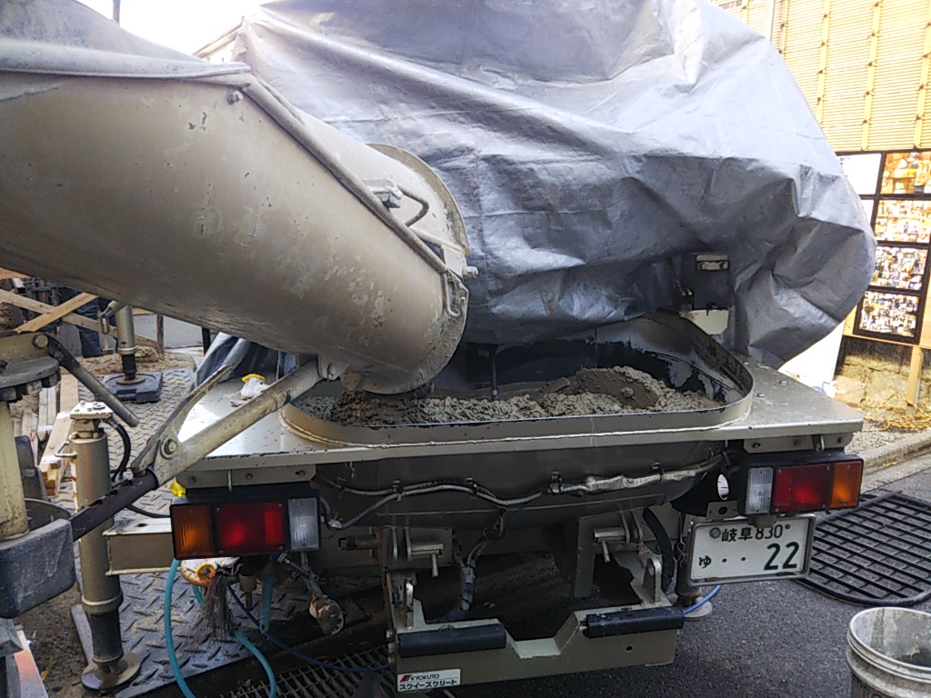 今回は先日打設したベースコンクリートに比べ、生コンの量は少なくて済みます。