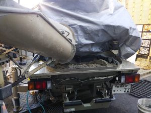 道路も狭いため大型のアジテーターも近寄れず、小型のもので運搬してもらっています。そのため台数が多くなりますが、入れ代わり立ち代わりやってきますので、打設工事は滞りなく進んでいきます。