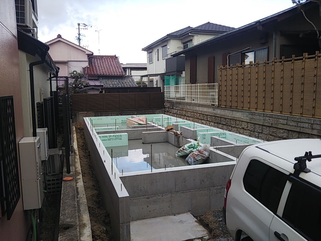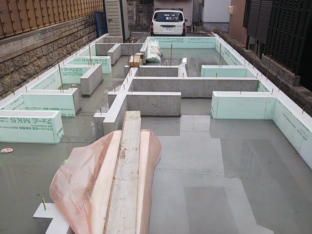 基礎コンクリートの脱型が終了していました。基礎の中には前日に降り溜まった雨水が流れずに残っています。底板と立上り部分の打設が甘いと打ち継ぎ目から漏るのですが、文字通り蟻の這い出る隙間もないピッタリとした基礎コンクリート施工、水一滴も漏らさぬ精度・・・自慢している場合ではない。午後から職人さんに水の汲み出しをしてもらわなければいけません。