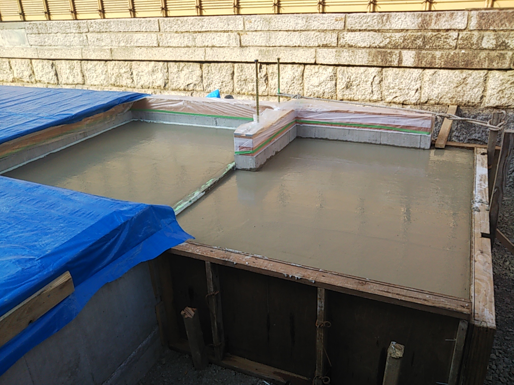 無事にコンクリートの打設が終わった・・・と思った翌日から天候が崩れ始め、『梅雨に逆戻りか』というくらいお盆期間中は連日雨天の予報です。打設の前日も雨天であり、生コンクリートの運搬手配も『お盆前で忙しく、この日しか空いていない・・』というまさにピンポイントのタイミングで施工する事ができました。お盆期間中はコンクリートの良い養生期間となります。普段は自他ともに認める雨男の筆者ですが、この時ばかりは『天は我に味方せり。』という心境です。