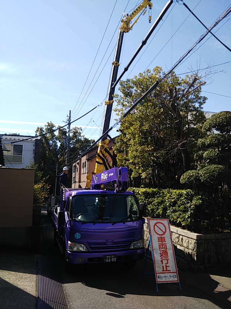 狭小道路につき、事前に近隣の方に告知をして、この日は完全に通行止めにさせてもらいました。お隣様の住宅も迫っていますので、レッカーのオペさんには細心の注意を払って作業してもらいました。