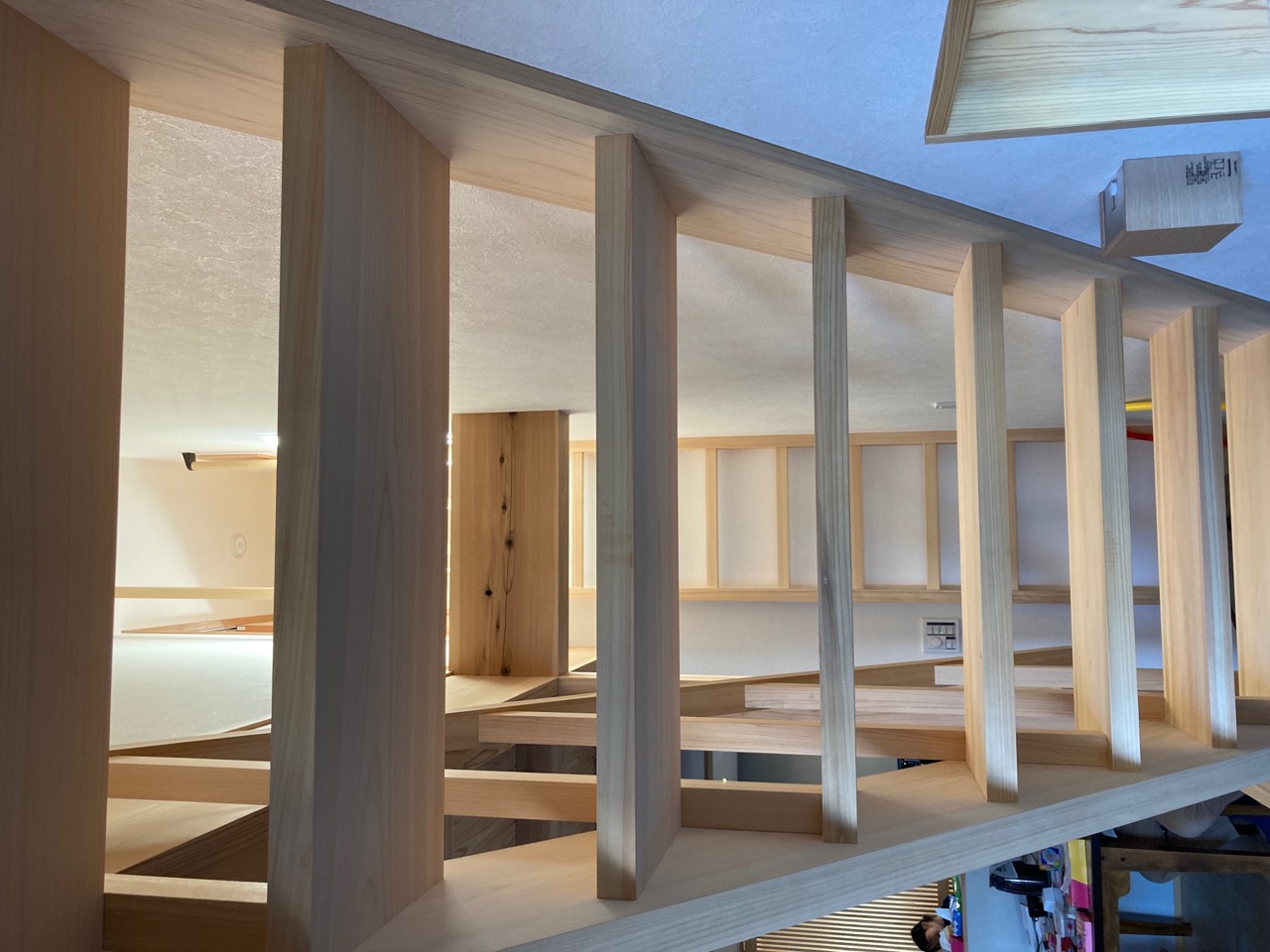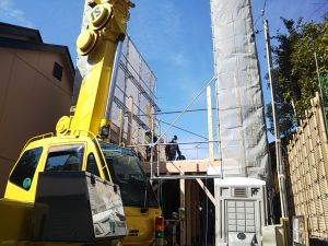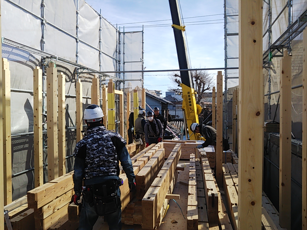 いつもであれば2階の柱、梁が組まれてくるとだいたい住宅の形も見えてくるのですが、今回は3階建てですので、上階にもう一層構造が組まれます。