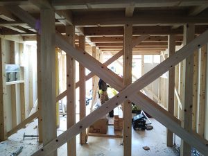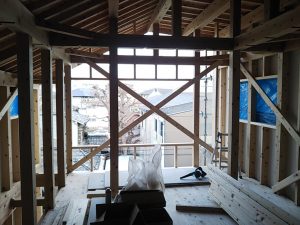 1階の構造は軽量鉄骨で造られており、各所にブレーシングが入っています。木造住宅でいうところの筋違(耐力壁)です。狭小間口なので比較的頑丈な構造で造られています。