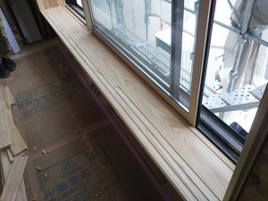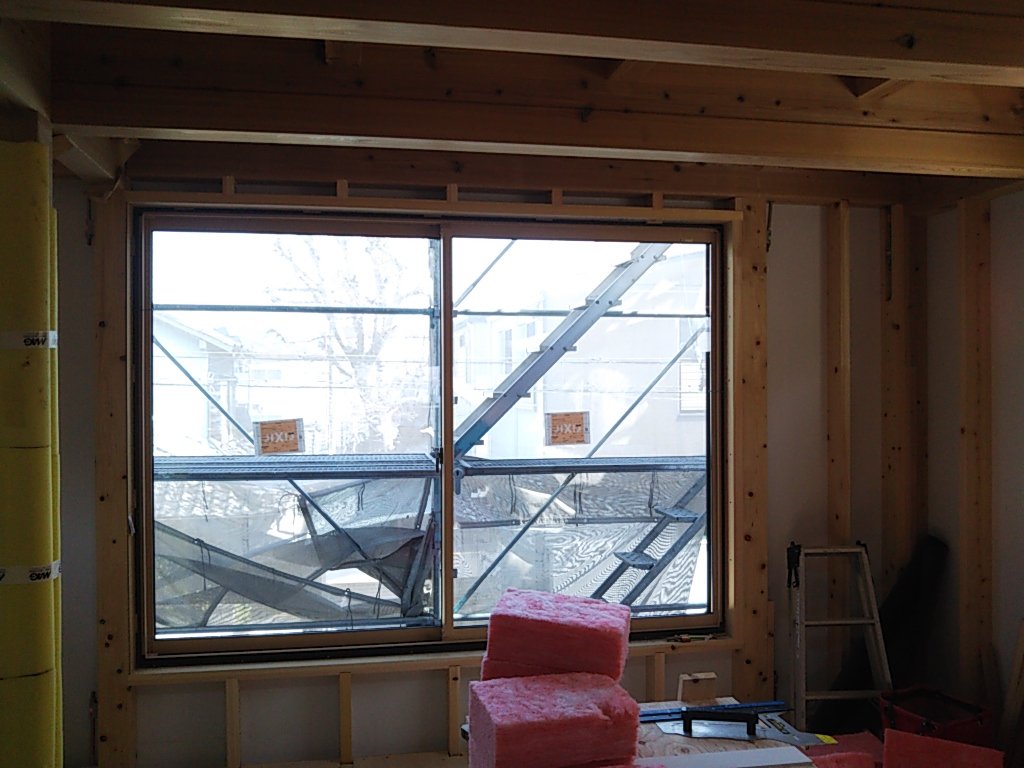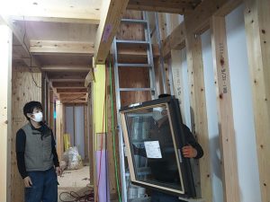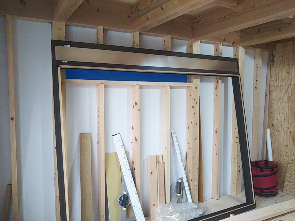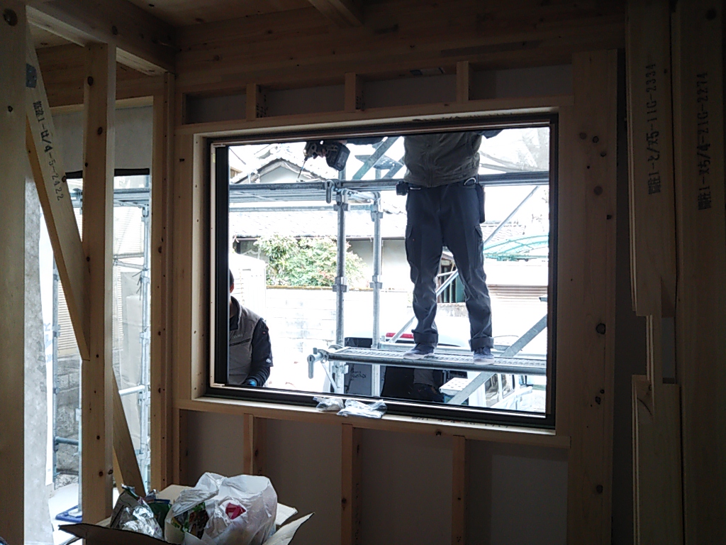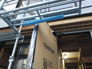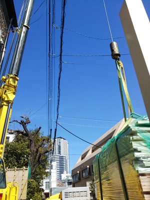 サッシの搬入。数はそれほど多くありませんが、なにせ3階まで運ぶのも一苦労です。近年はサッシの高断熱化が進み、特にガラスはペアガラスがスタンダードです。そのため重量も増し、上階になればなるほど施工もメンテナンスも大変です。