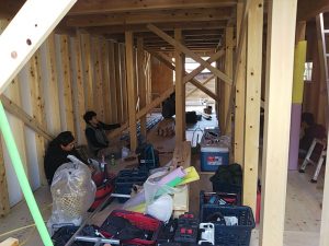 3階の床に差し掛かったところで昼食タイム。大工さんたちはさすがに動き詰めで少し暑かったと見え、日影になる場所で休みます。それでもしばらくすると寒くなってきて、日向へ移動していました。