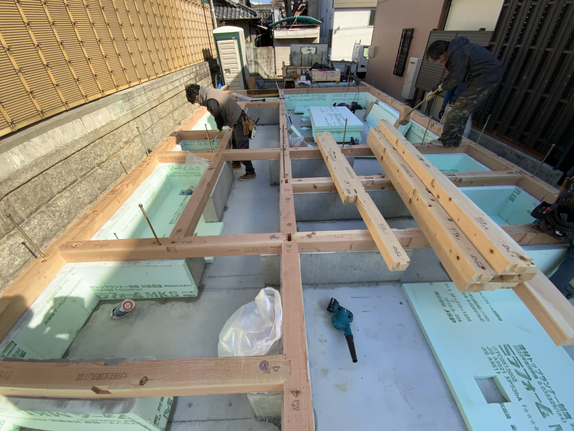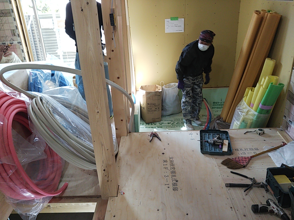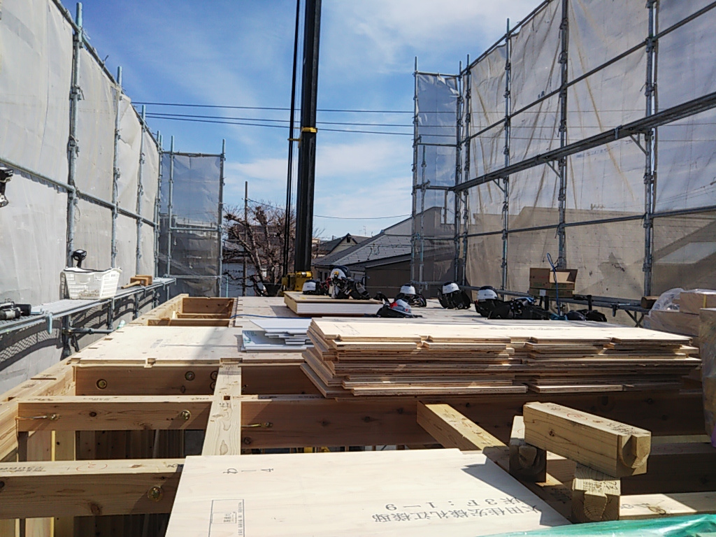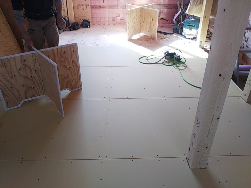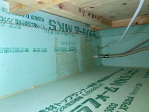 土台伏工事が終わり、1階部分の床下地合板まで敷き終えました。不意に雨が降っても基礎に雨水が溜まらないようにシートでバッチリ覆っておきます。合板まで敷いた後に雨が降って水が溜まった時の絶望感と言ったら・・・。上棟日まで雨が降らない事を祈るのみですが、幸い天気予報では大丈夫なようです。