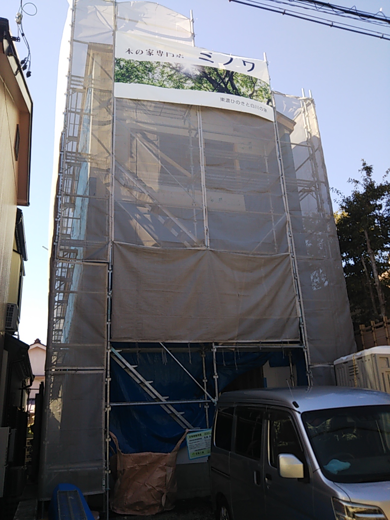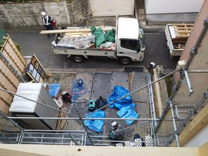 風にあおられないように足場シートはまとめて下げておくだけで作業は終了。明日はいよいよ上棟です。