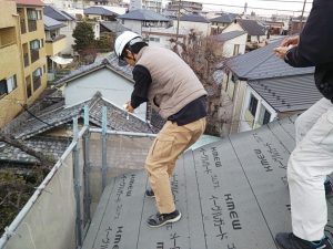 この日の作業終了。屋根に上ってお神酒とお塩でお清めをしています。高いところに慣れている棟梁に比べて右端に写る筆者のこのへっぴり腰具合。屋根上でいえば4階に相当する高さです。高さ制限の都合上屋根勾配も急にしてあるので、慣れていなければ腰も引けようというものです。