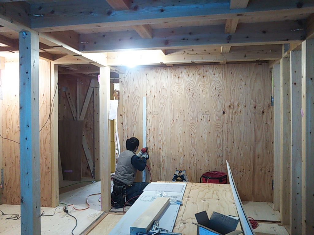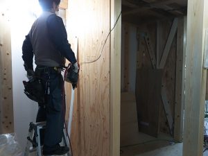 中間検査に向け、構造金物や耐力面材の取付が進んでいます。木造3階建てにつき構造計算を行っていますが、都市部の3階建て住宅はえてして極端なうなぎの寝床状の敷地に建つ事が多く、住宅の平面計画も細長くなる事が多いです。長い方にはたくさん耐力壁を取る事ができるのですが、短い方向には空間が分断されるためなかなか耐力壁を取る事ができません。結果、できるだけ一つの個所に力の強い耐力壁を集中させる手段を取る事が多くなります。上記写真はそのわかりやすい例と言え、一つの壁に筋違ダブル(たすき掛け)プラス構造用合板で耐力を取っています。
