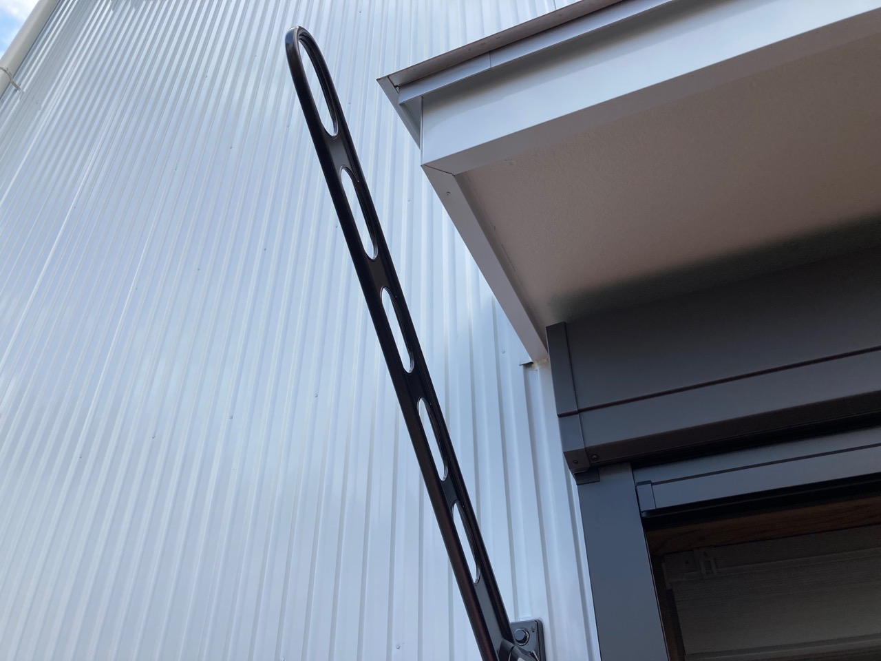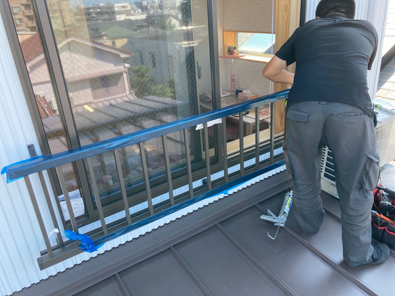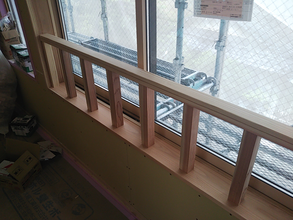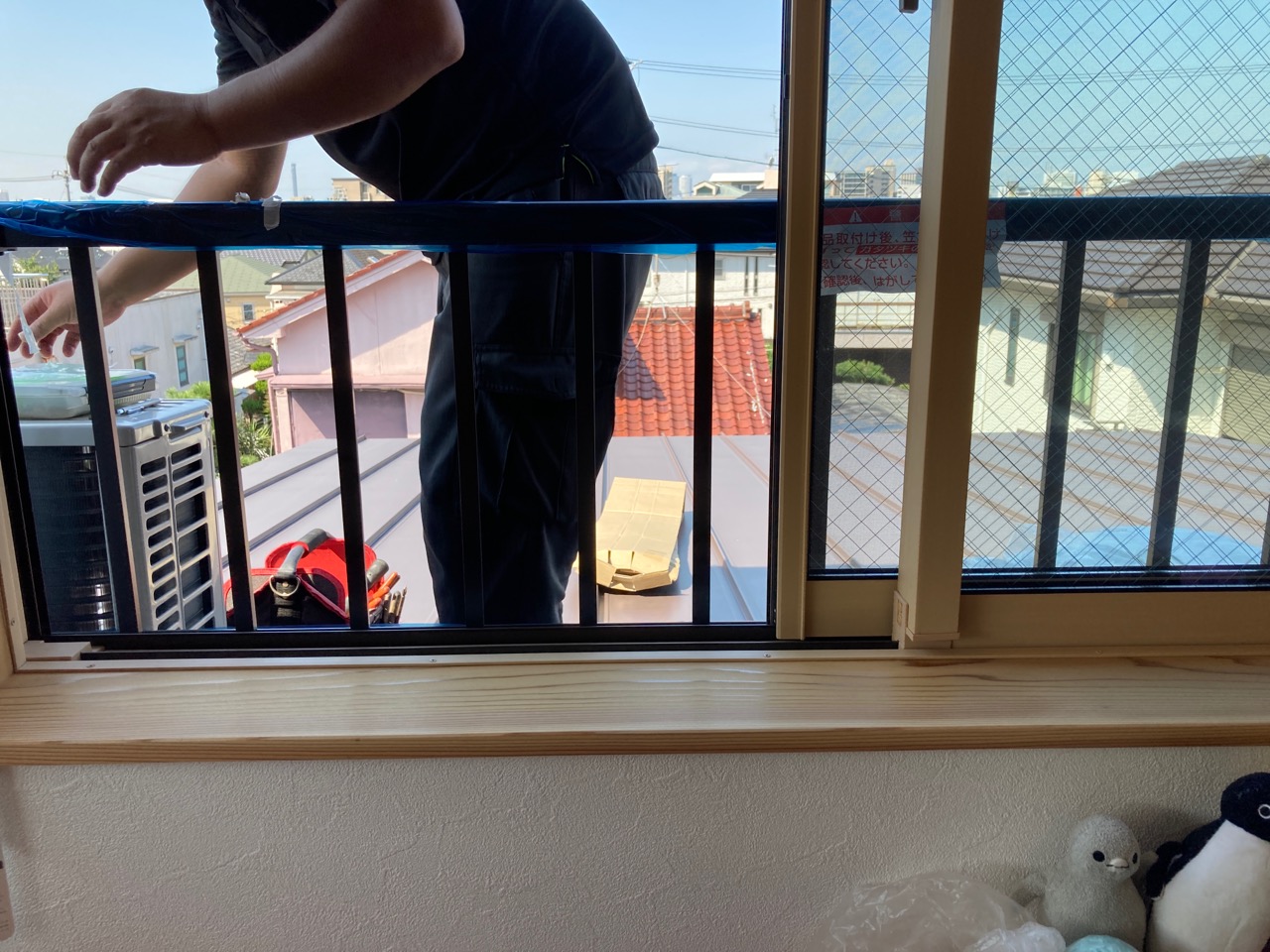 3階のERIちゃんの部屋の窓にはアルミ手すりが取り付けられています。天気の良い日には手摺に布団をかけて干せるようにとの事で取り付けました。外部の下屋(2階の屋根)は勾配が緩いとは言え作業は結構な怖さです。