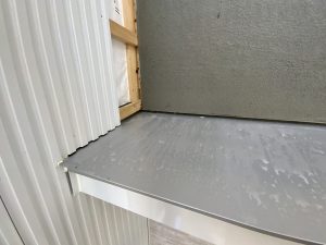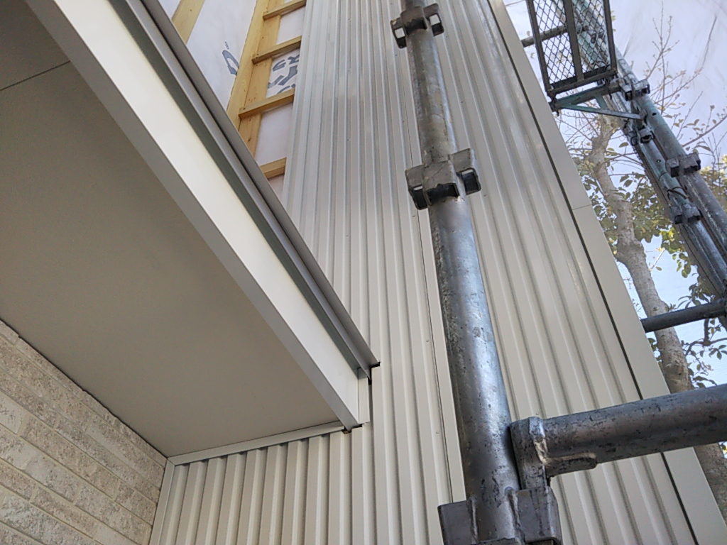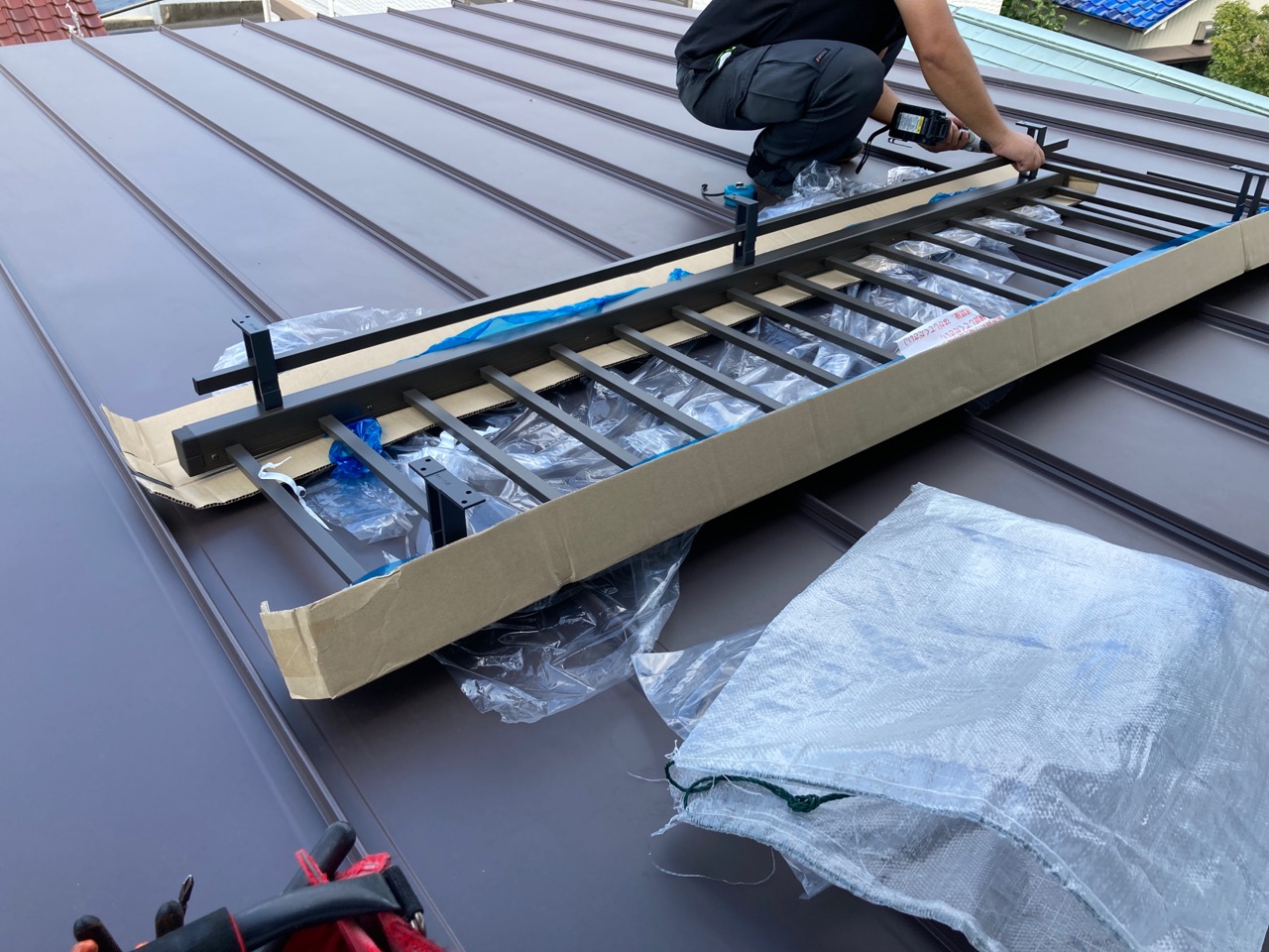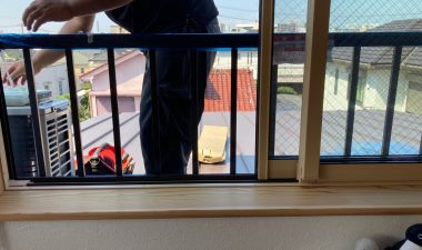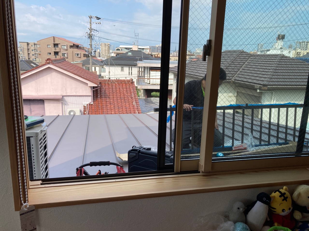 3階のERIちゃんの部屋の窓にはアルミ手すりが取り付けられています。天気の良い日には手摺に布団をかけて干せるようにとの事で取り付けました。外部の下屋(2階の屋根)は勾配が緩いとは言え作業は結構な怖さです。