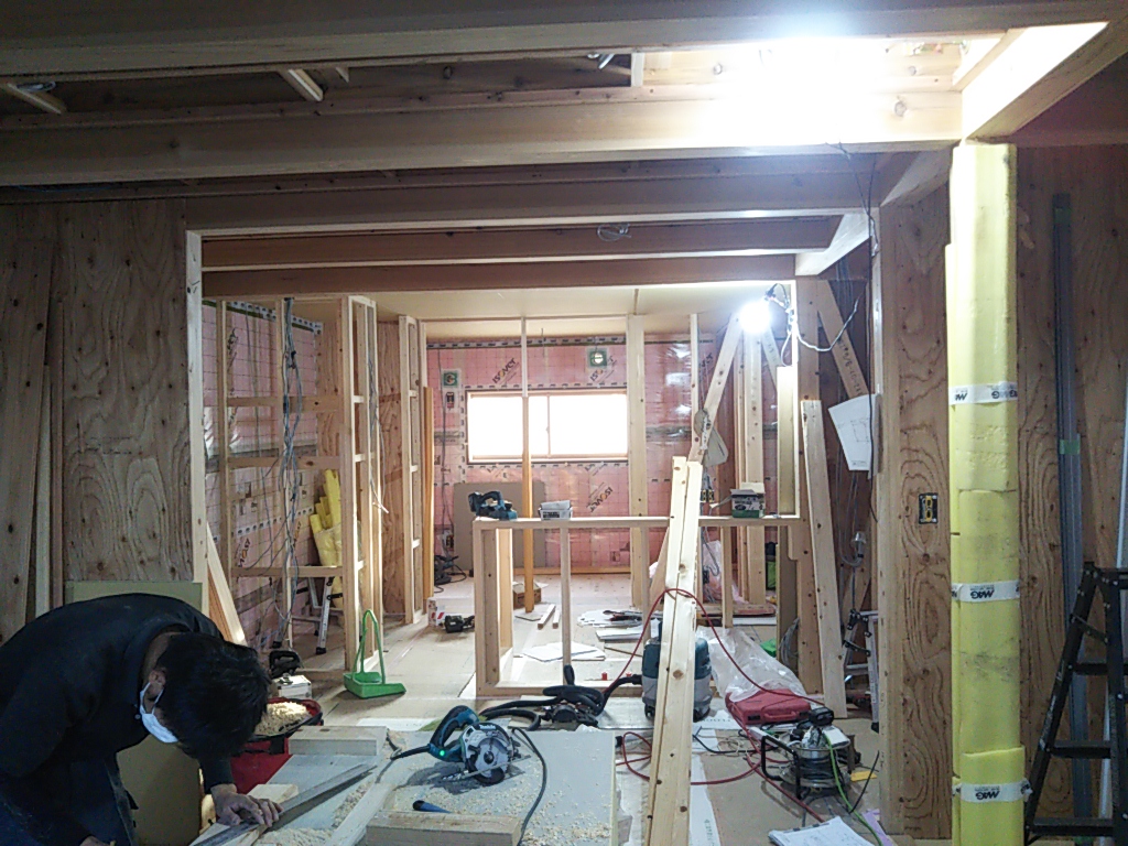 昨日降った雪は完全に溶けてなくなったものの、寒さだけは残った本日、土台伏せ工事が行われました。若手大工二人が寒さに凍えて作業する中、雑コンクリートの型枠を据え終えた基礎部隊のtさんが参戦。『どうだい、俺の基礎はまっすぐだろぅ』と言わんばかりの張り切りっぷりです。コテをかけやに持ち替えて若手に交じって土台伏せ。クラフトマンの血が騒ぐのでしょう、分かりますとも、筆者もその場に居合わせたならハンマーをもって参加したいところです。若手二人には『狭い現場に大勢いてもジャマだしオッサン早く帰らんかなー。』と思われているかもしれませんが。少し前まではそっち側にいたtさんや筆者たちも若者に邪険にされながら満更でもなく目を細めるようなオトシゴロになったという事です。