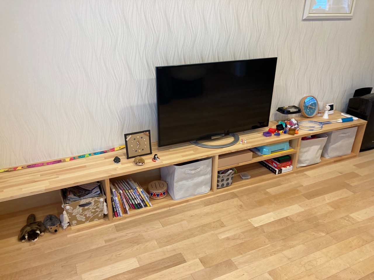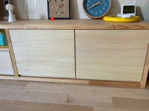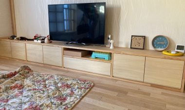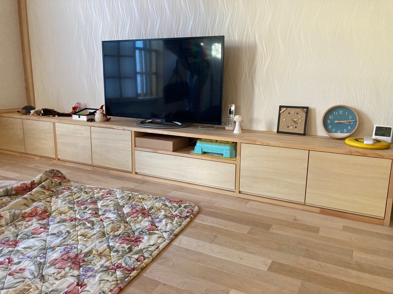 リビングに設えたテレビ台の棚に引出を取付けたい、との事で実寸法を採寸にやってきました。収納されている雑多な生活小物をしまっておきたいという事です。計画時は『これでOK』と思っていても、実際に生活されていると、『やはりこれが欲しい』という事は比較的よくあります。実際に生活してみないとなかなかイメージだけでは詰め切れない部分でもありますが、こうして後施工でもできる余白を残しておき、生活しながらアップデートしていくのもまた楽しみの一つでもあります。