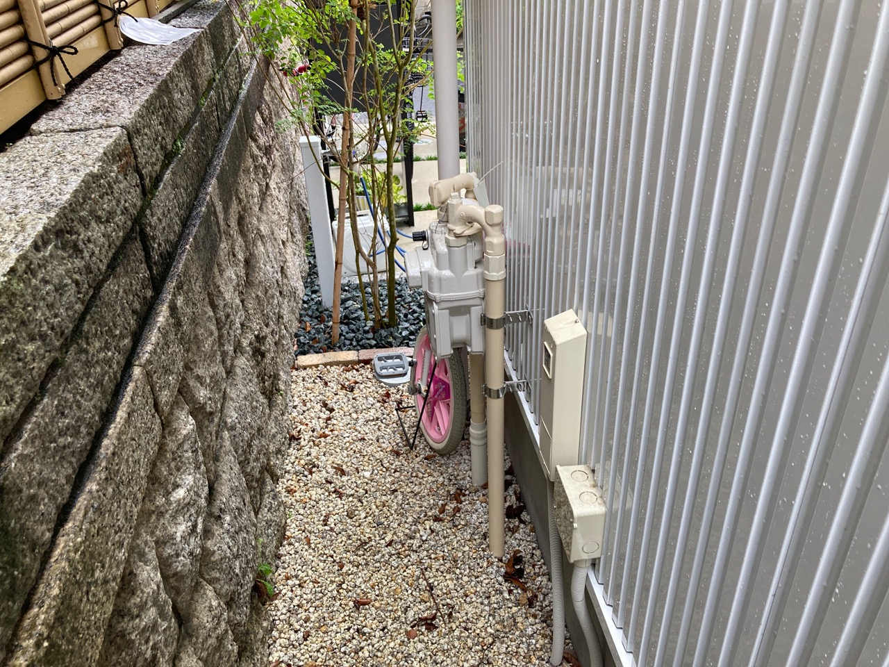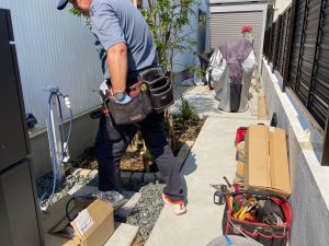 梅雨の雨間を狙って外構工事を開始しました。元々植栽等があった部分はコンクリートやウッドデッキになるため場所を移動します。まずは水栓の移動からスタートしました。