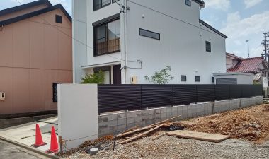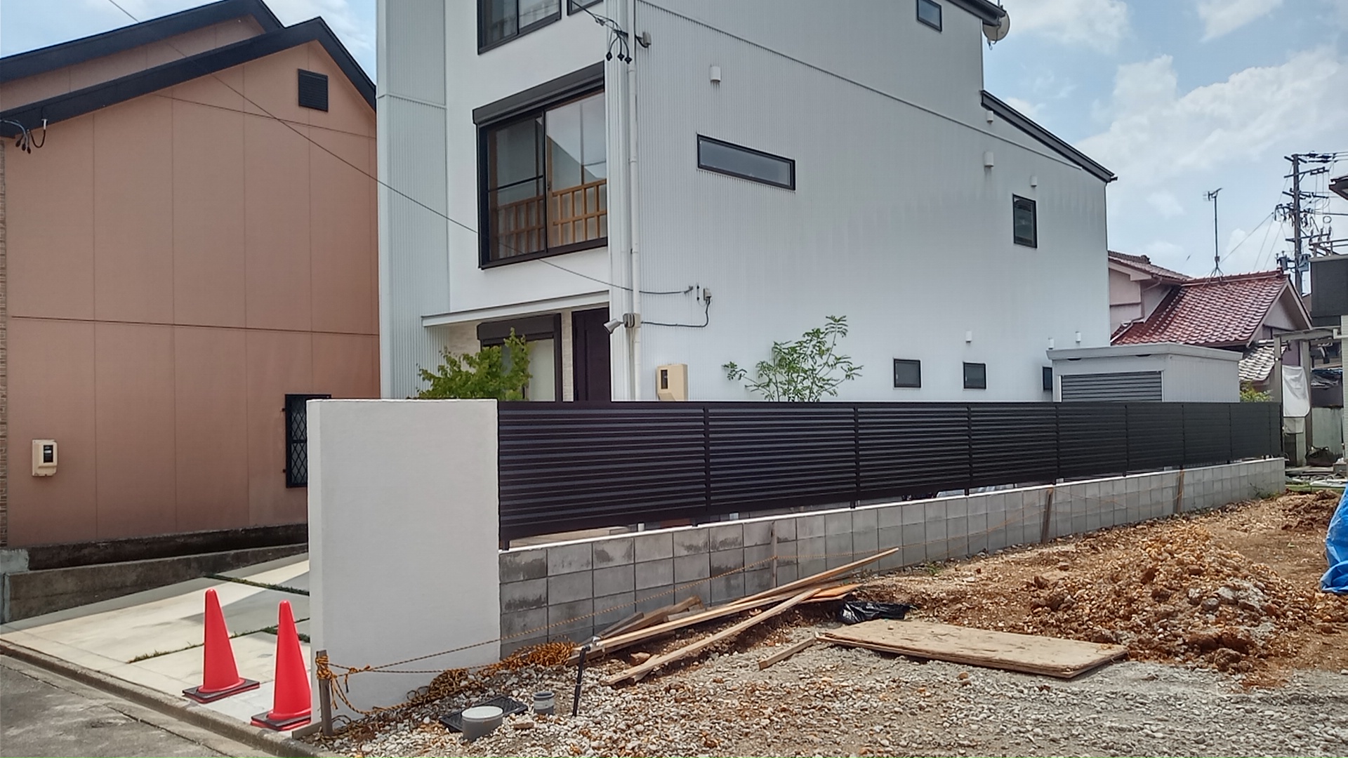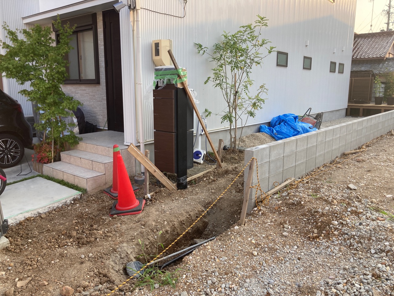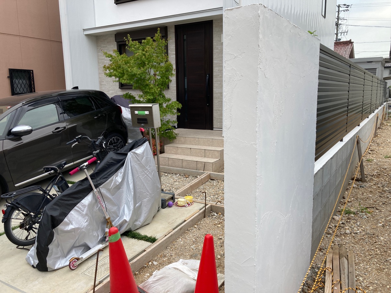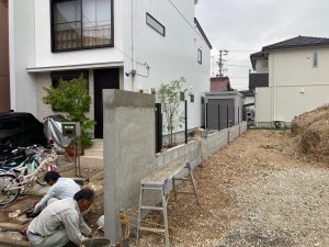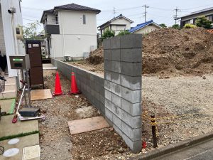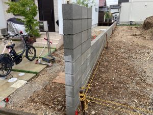 境界のブロック、フェンス柱もできあがってきました。今週はところどころ天気の悪い日が散見され、なかなか工事も思うように進まない所があると思います。