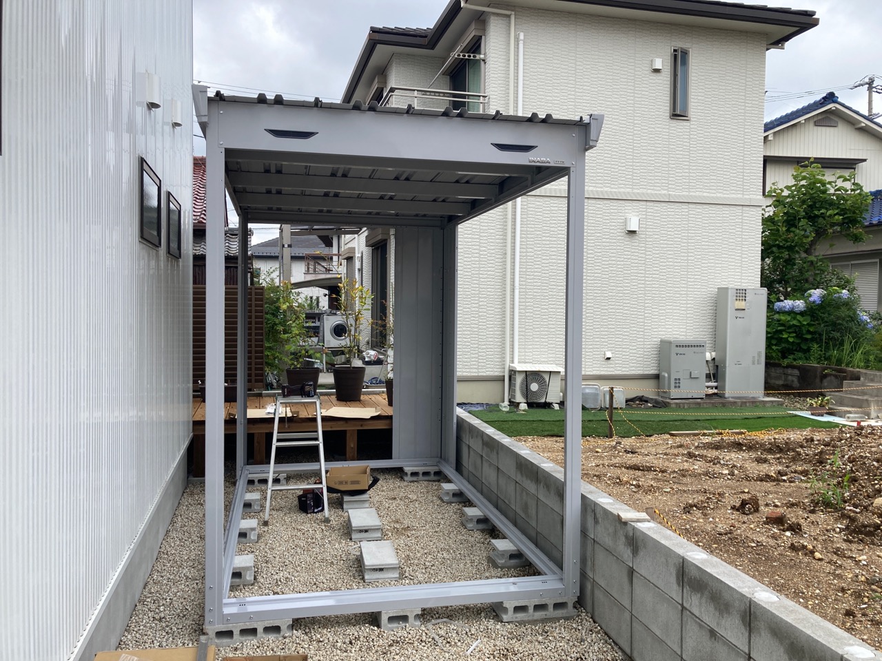拡張した敷地の奥にo様がお仕事上欲しいとあった収納スペースを広げるための物置小屋を設置しています。これだけ収納できるだけでも、屋内の方はだいぶ助かりますね。