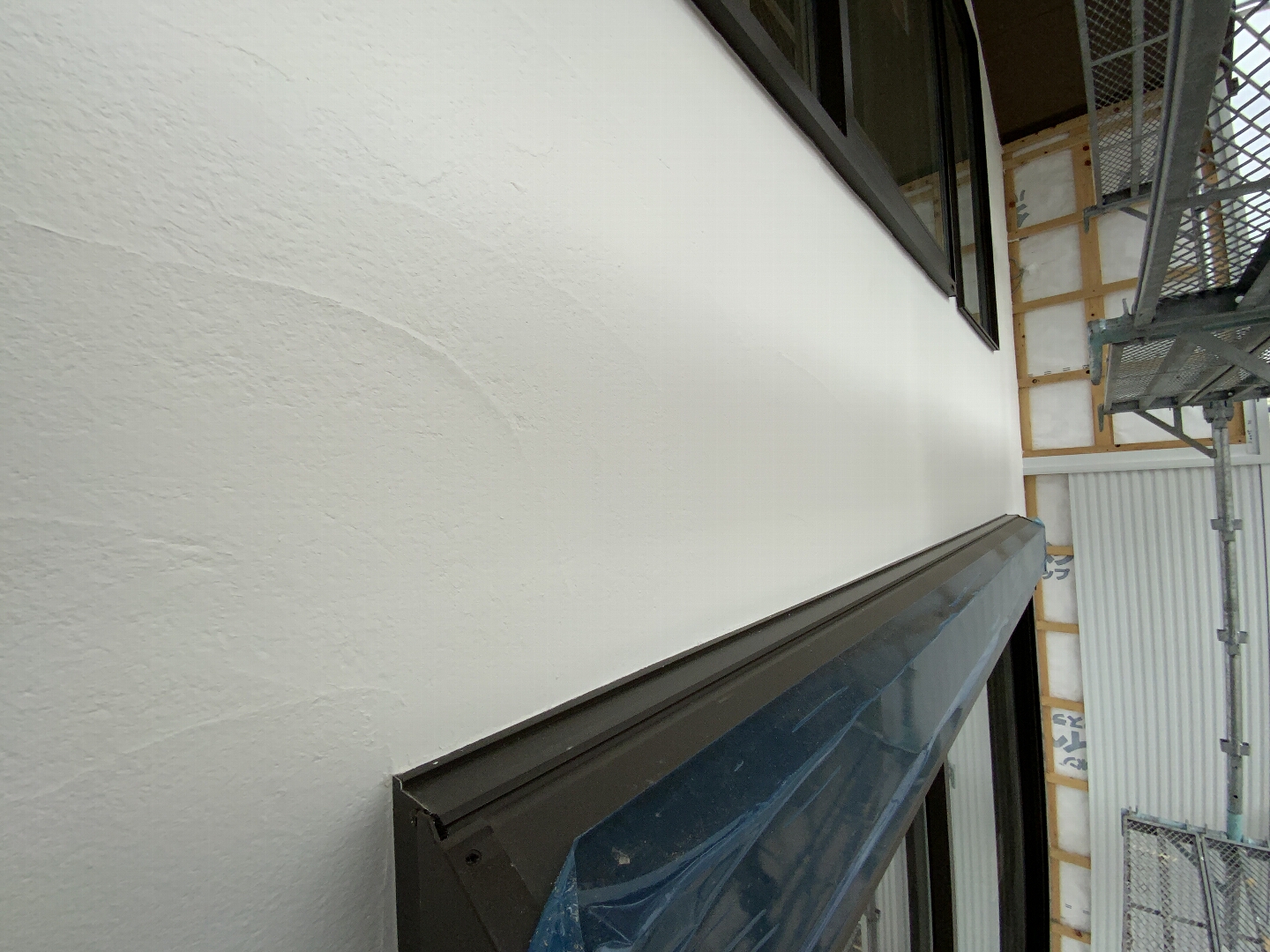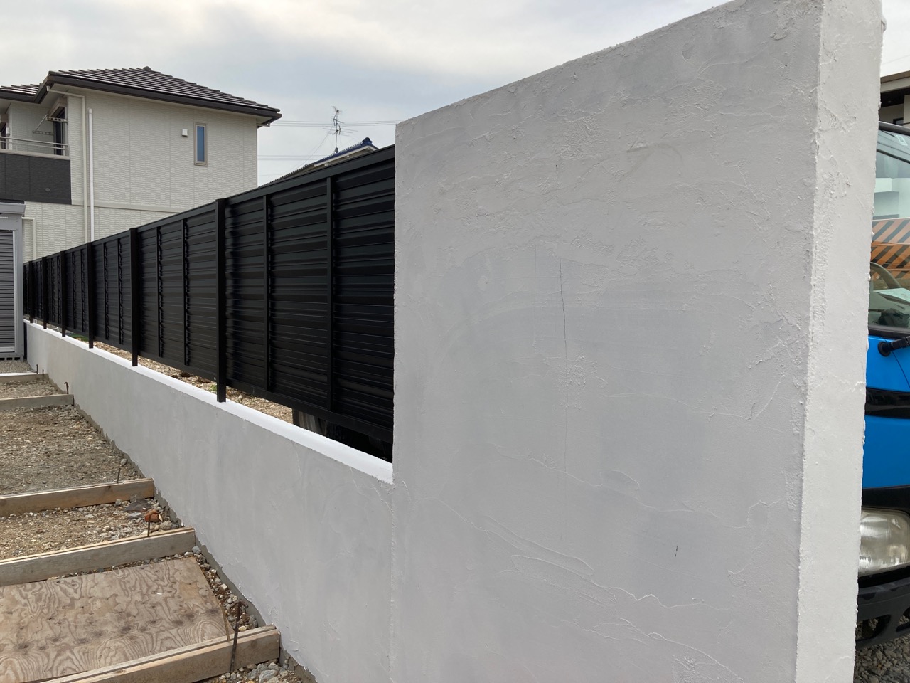 境界に設ける目隠し塀に仕上塗が施されました。(素人目ですがまだ中塗りだったりして)オーソドックスなホワイトのコテ塗の模様です。名古屋市の一角の住宅街、ご近隣と親密になりながらもある程度のプライバシーを保つ。時としてこのような目隠しも必要となるのかもしれません。