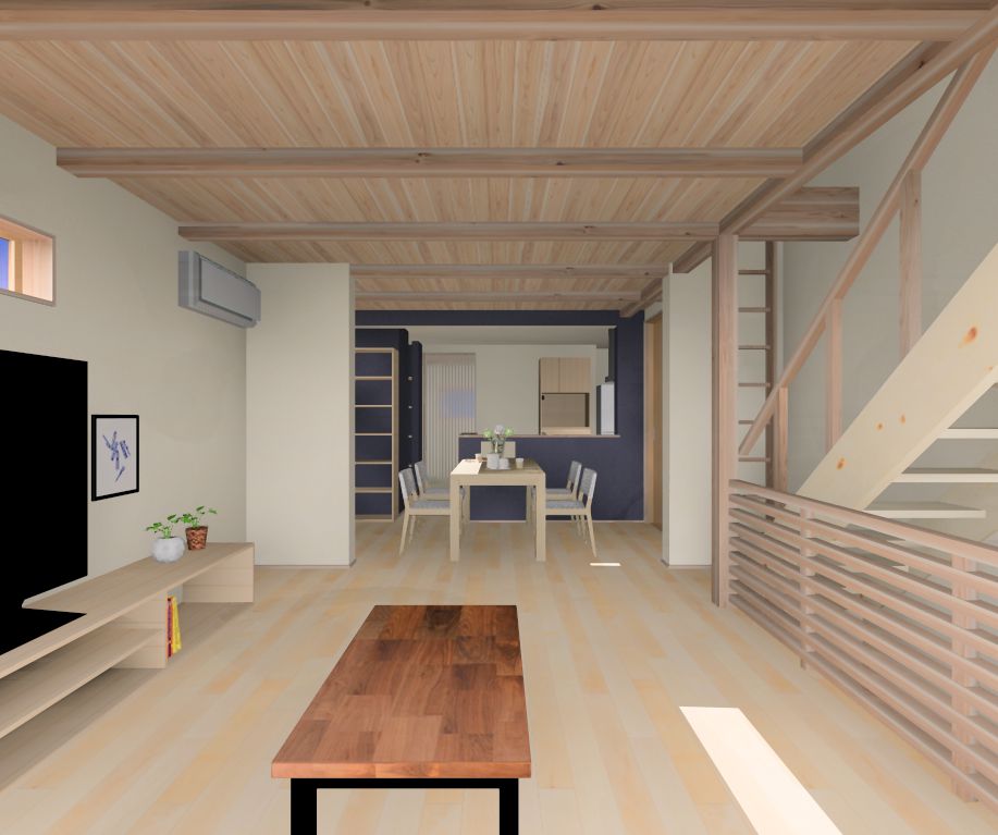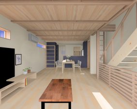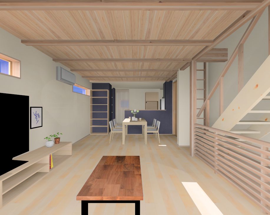 3階までくると、近隣の建物も遮る物が無く、かなりの明るさを確保できています。どちらかと言えば西日対策が必要になってきます。端の方は高さ制限の都合上かなり天井高を低くしなければなりませんが、屋根なりの勾配天井としているため、そこまで低さを感じさせません。