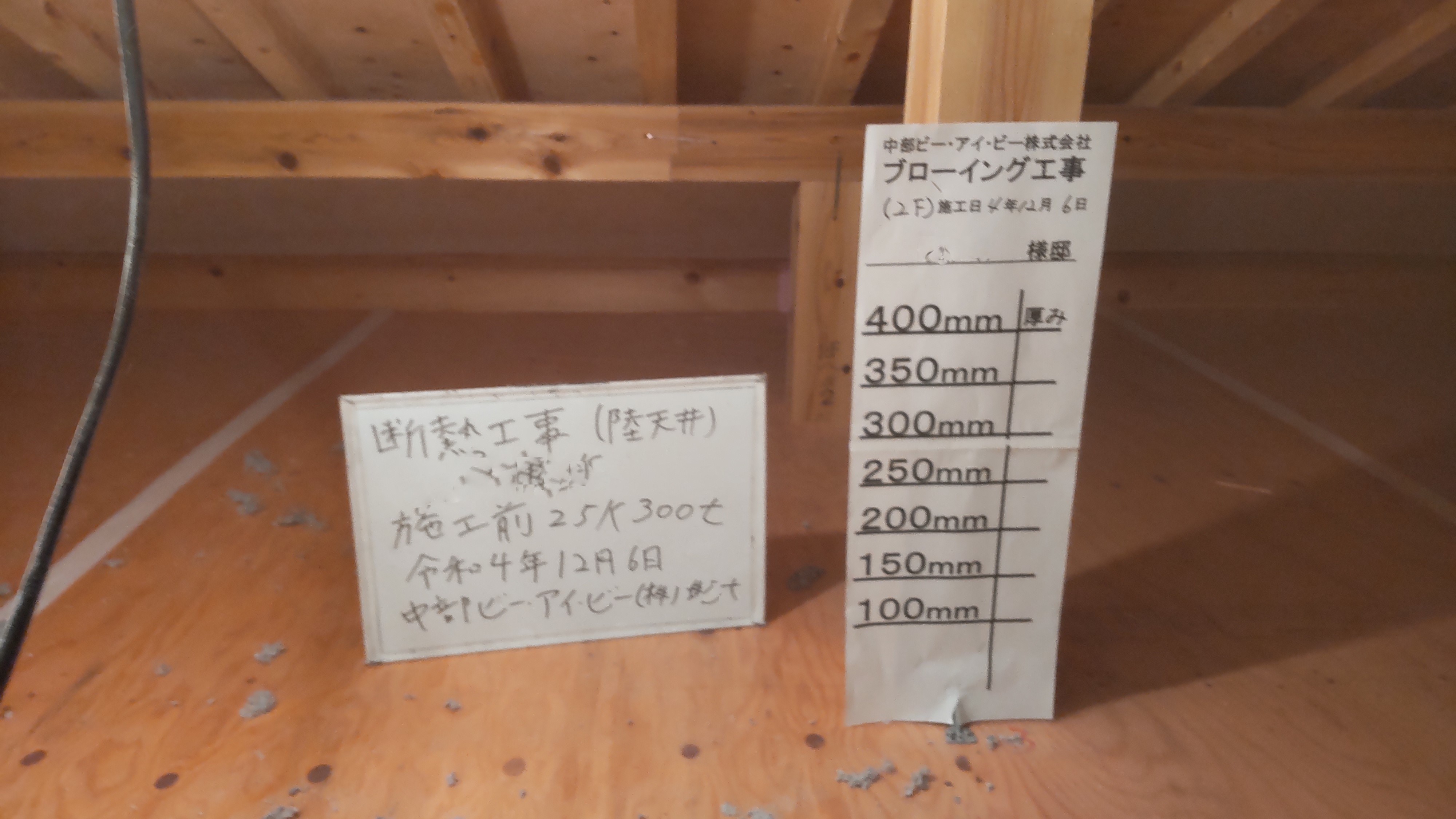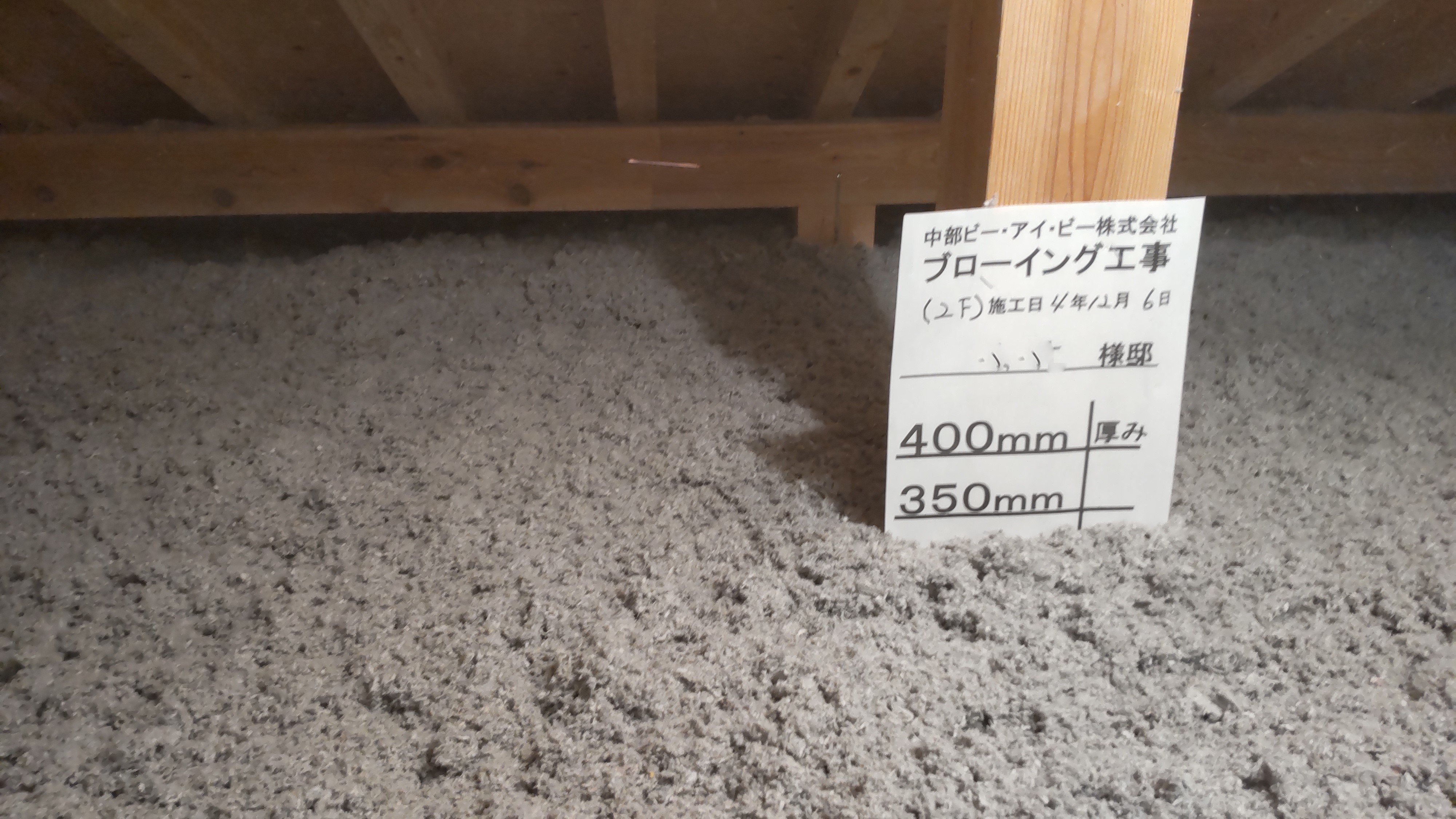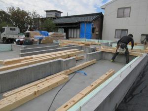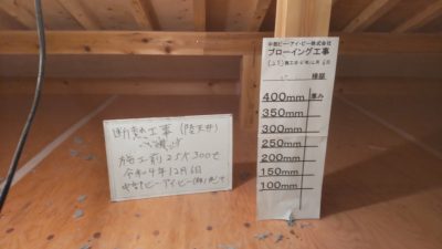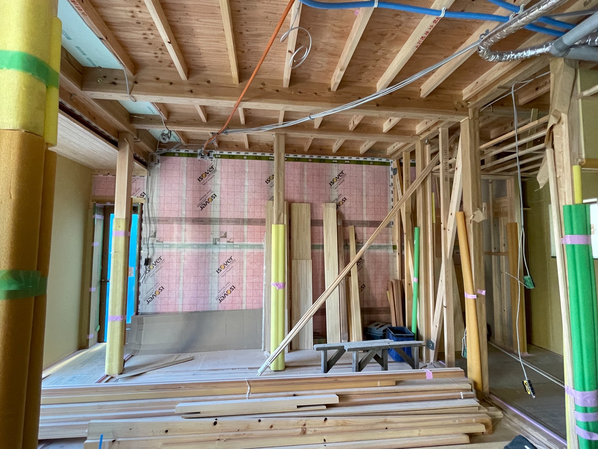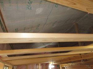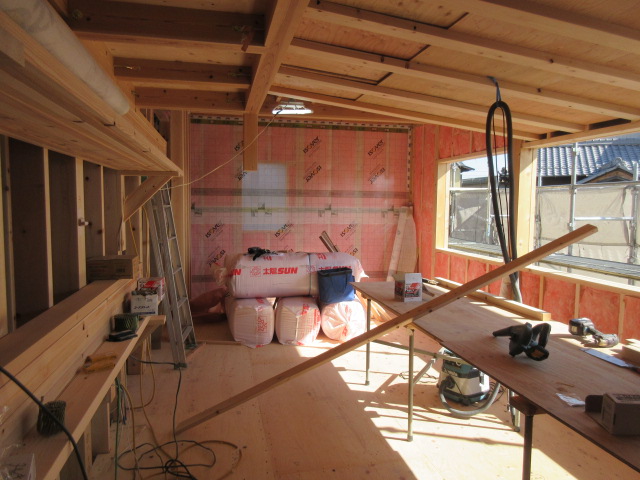 外壁には断熱用の下地が取り付けられ、この間に55㎜の高性能グラスウールを充填します。室内には同じく高性能グラスウールの充填が進んでいます。こちらは厚み120㎜でその上から気密シートを張っていきます。