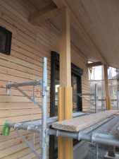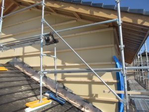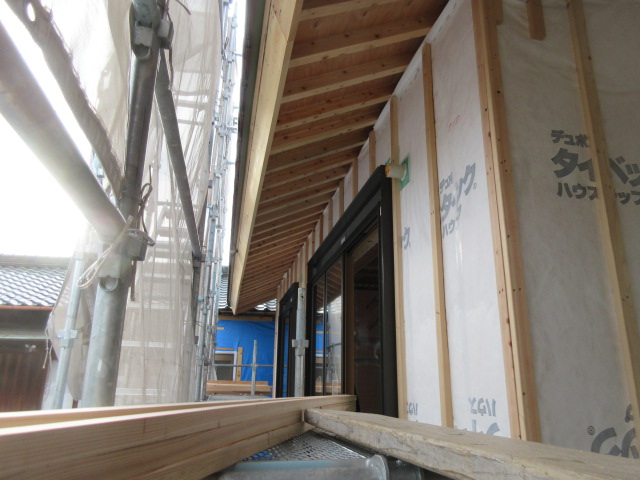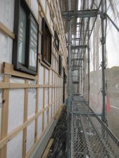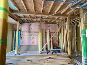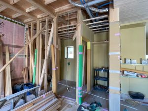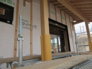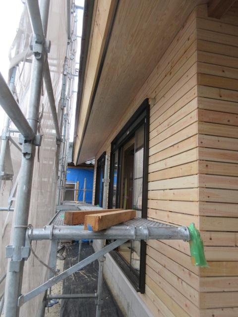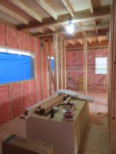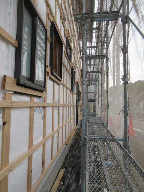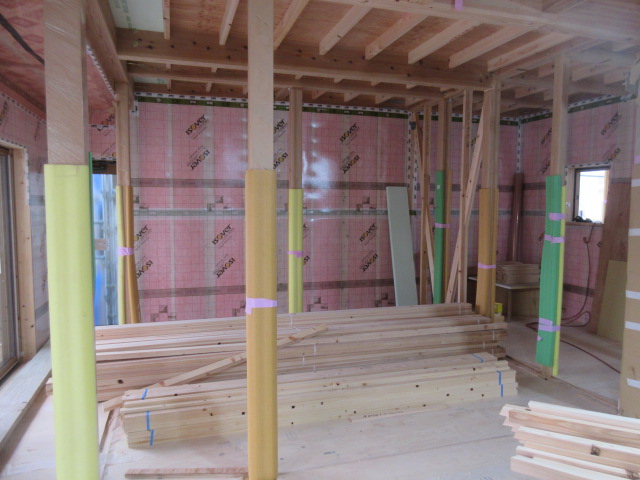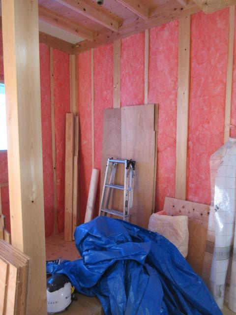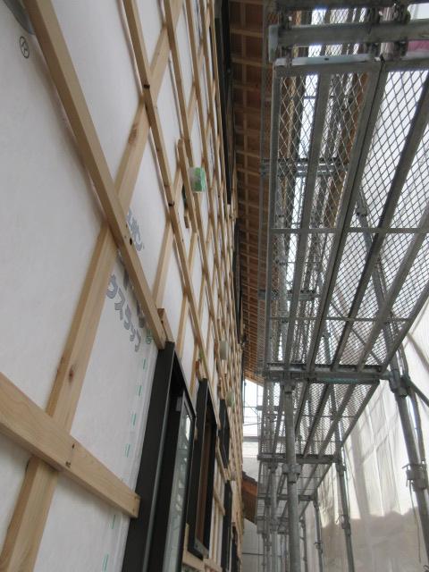 外部は高性能グラスウール充填後下地胴縁まで進み、この後ガルバリウム鋼鈑を張ります。今回の現場はガルバリウム鋼鈑と漆喰で仕上げが2種類あります。