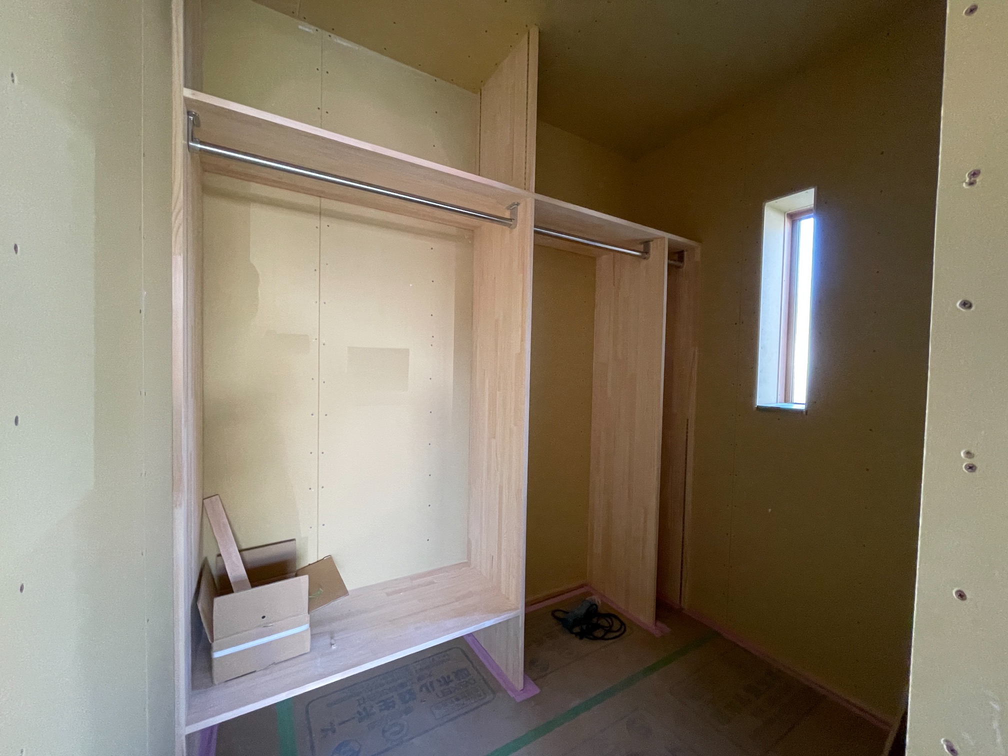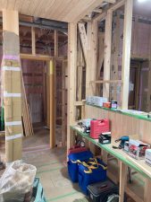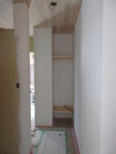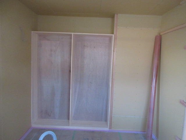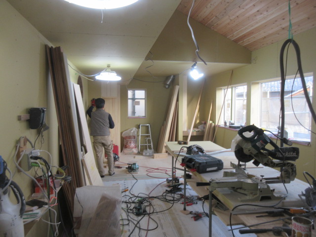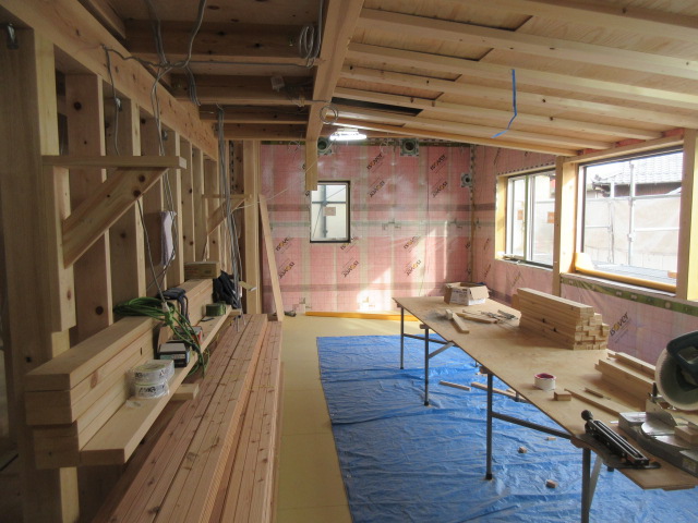 室内造作工事は2階は完了し、1階も収納棚・ニッチなどが着々と作られています。この後和室の造作に入るため、棟梁w大工さんはその材料や棚を本社工場で加工中です。