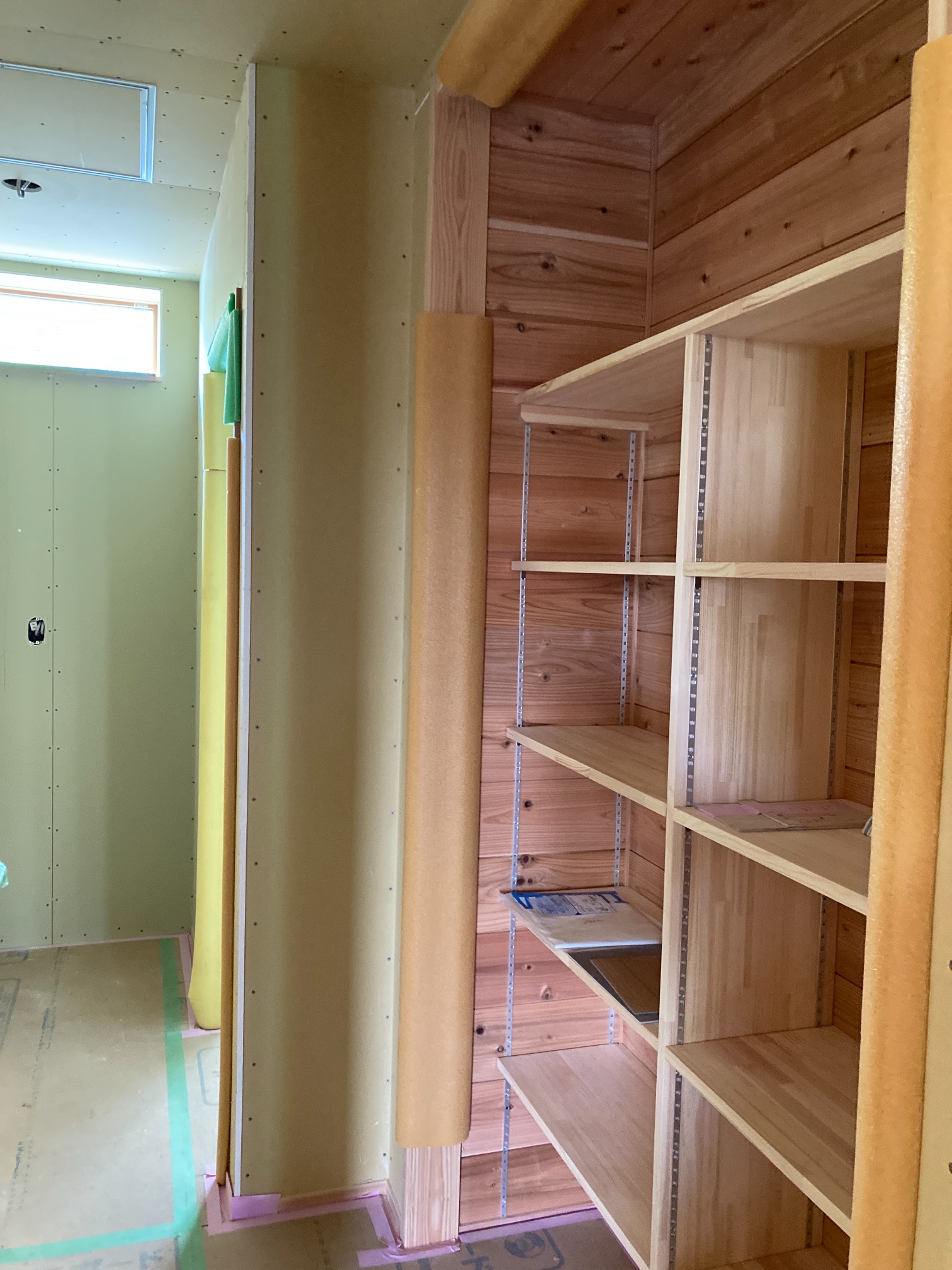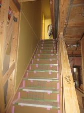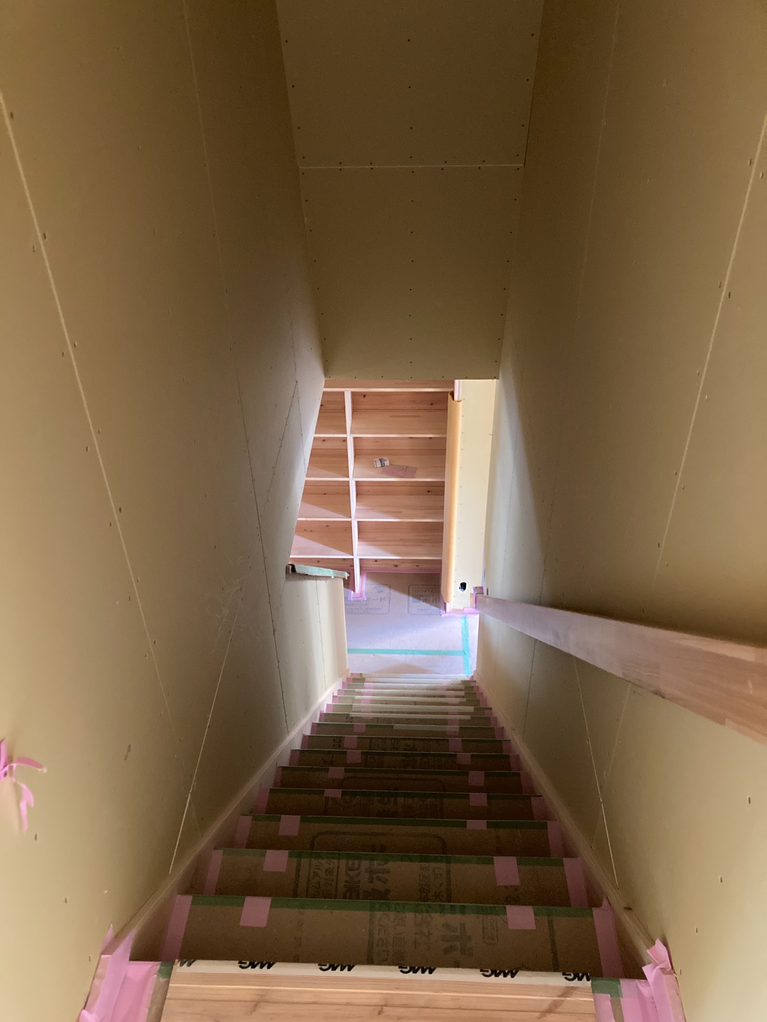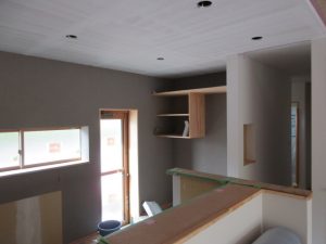 室内は階段が掛けられ、2階の壁・天井にプラスタボード、リビングの勾配天井には杉羽目板が施されました。洗面化粧台の収納や本棚などの造作工事も進んでいます。