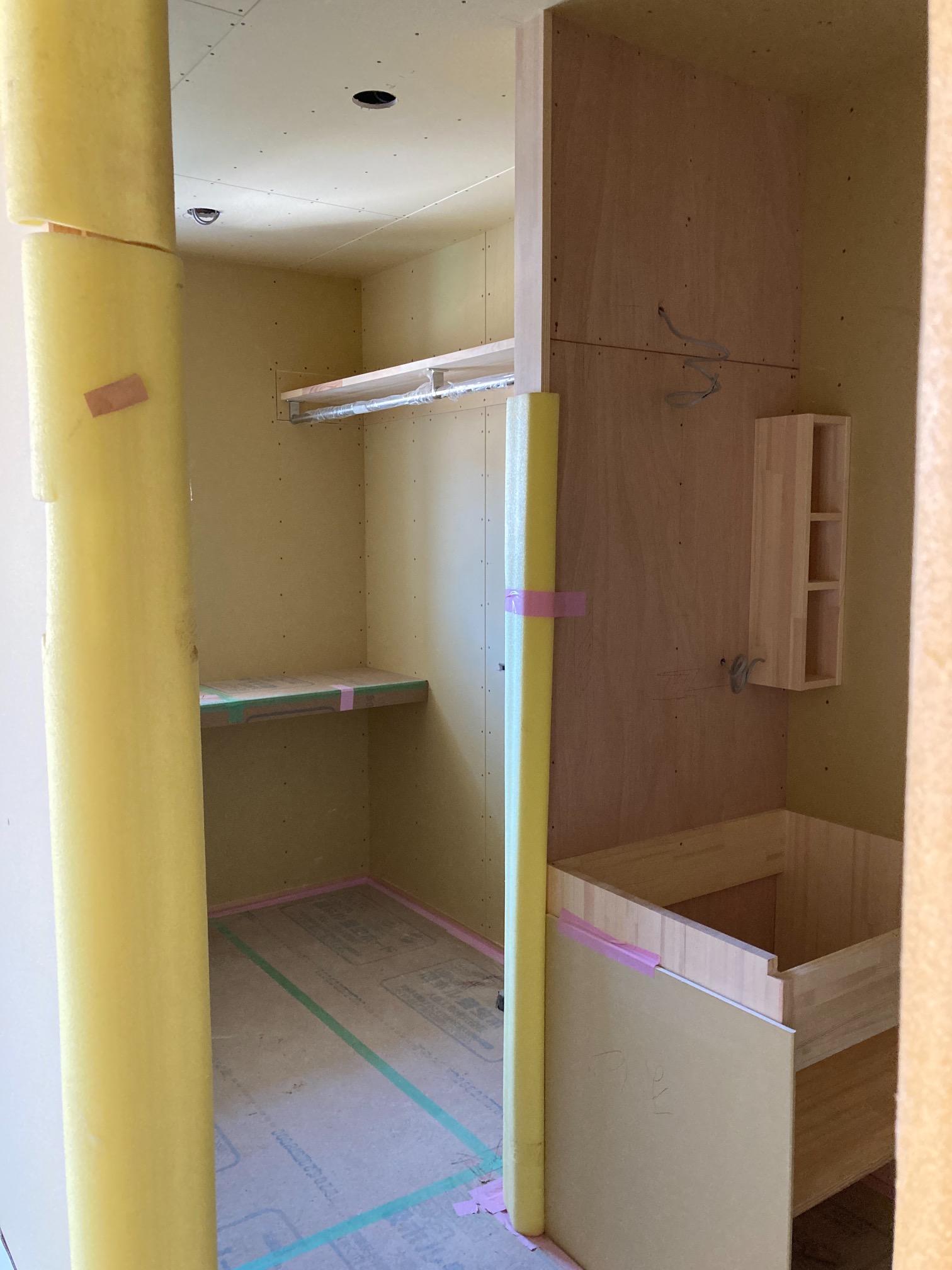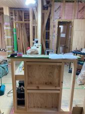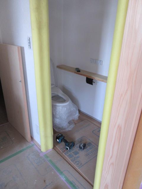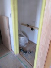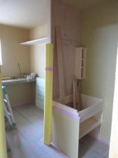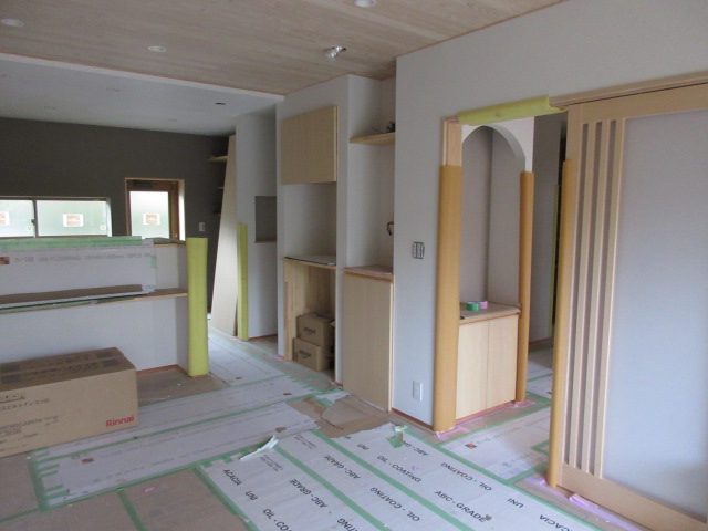 室内は2階の造作はほぼ完了し、1階のキッチン周辺のニッチやカウンターが造られました。トイレ手洗い器なしの無垢のケヤキカウンターは傷がつかないように完成までしっかり養生されます。