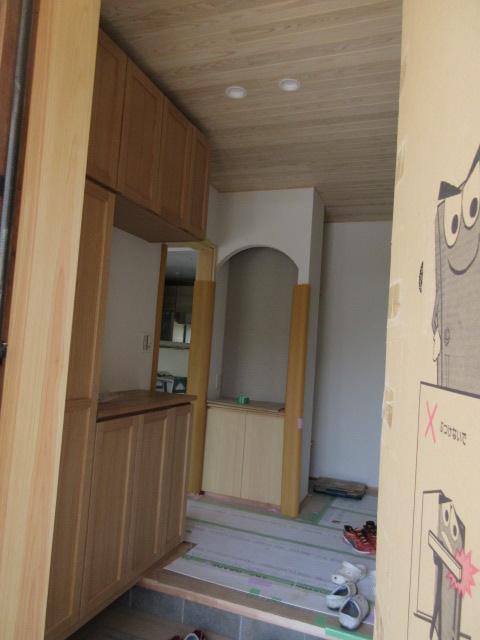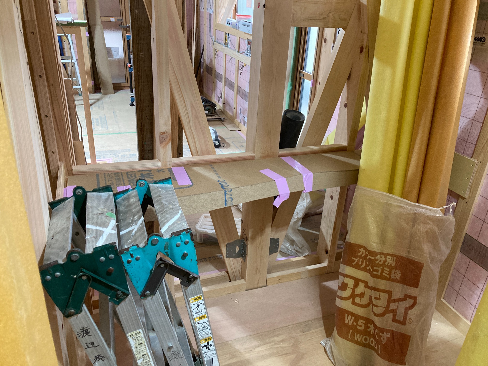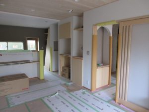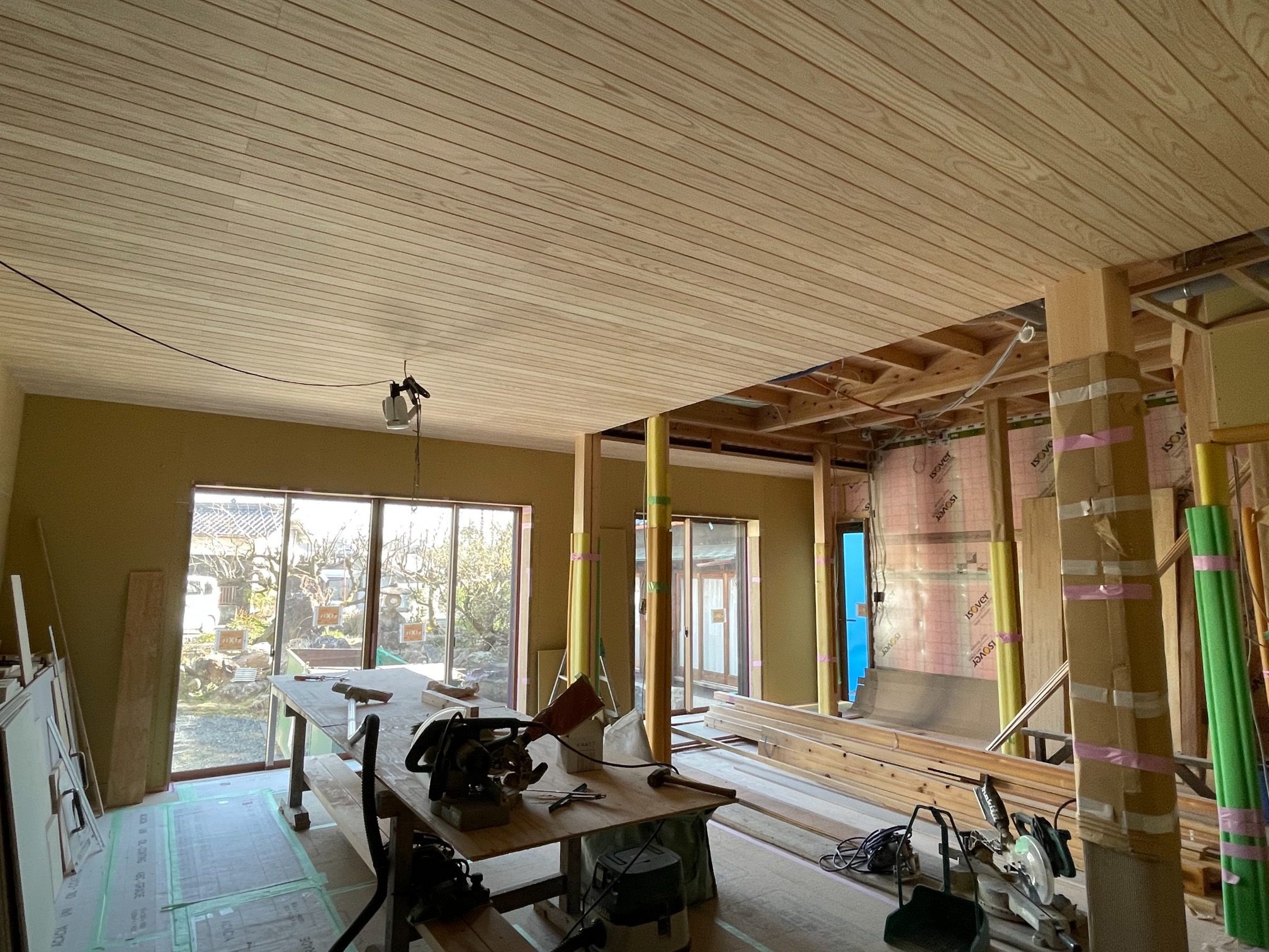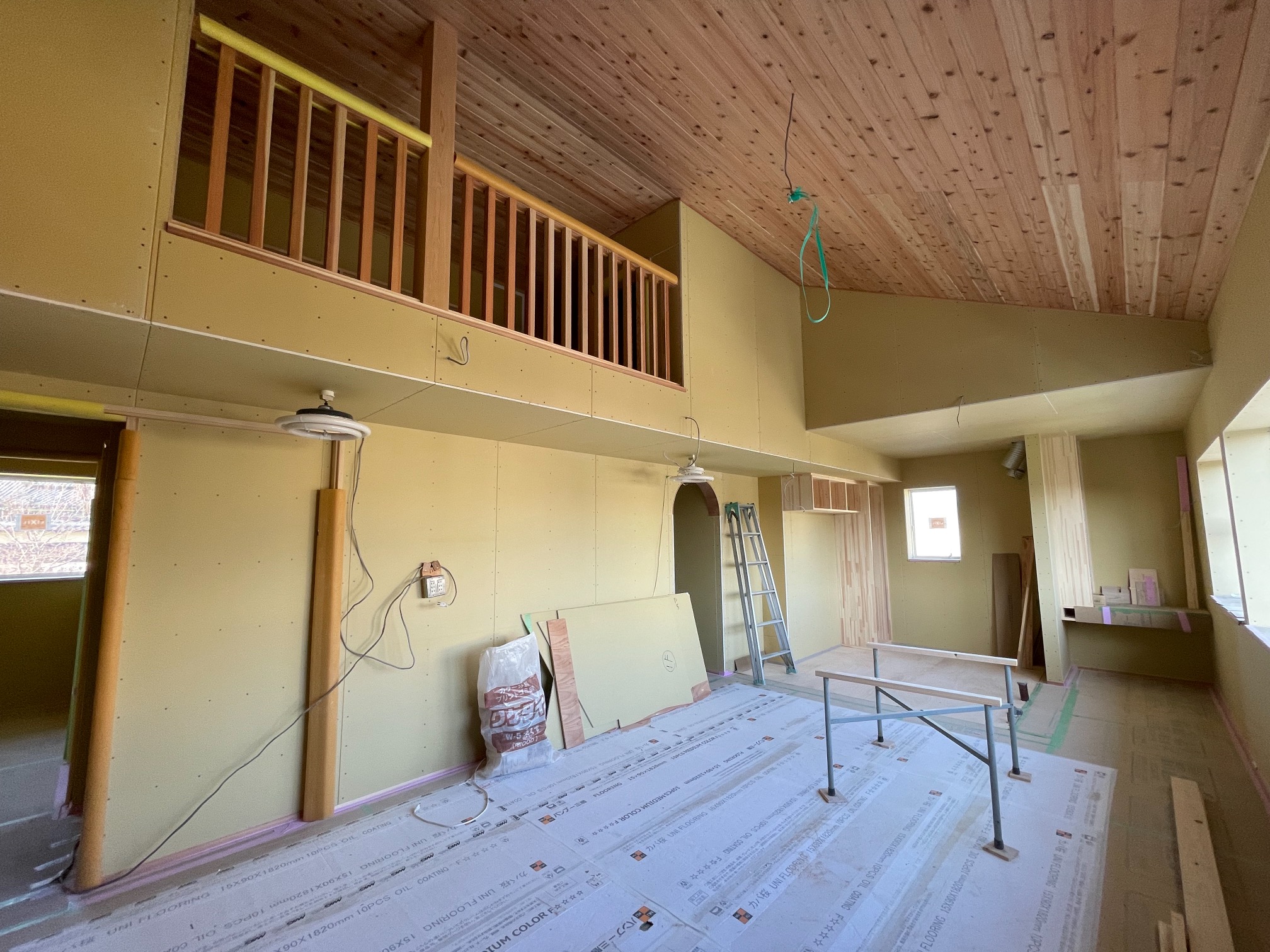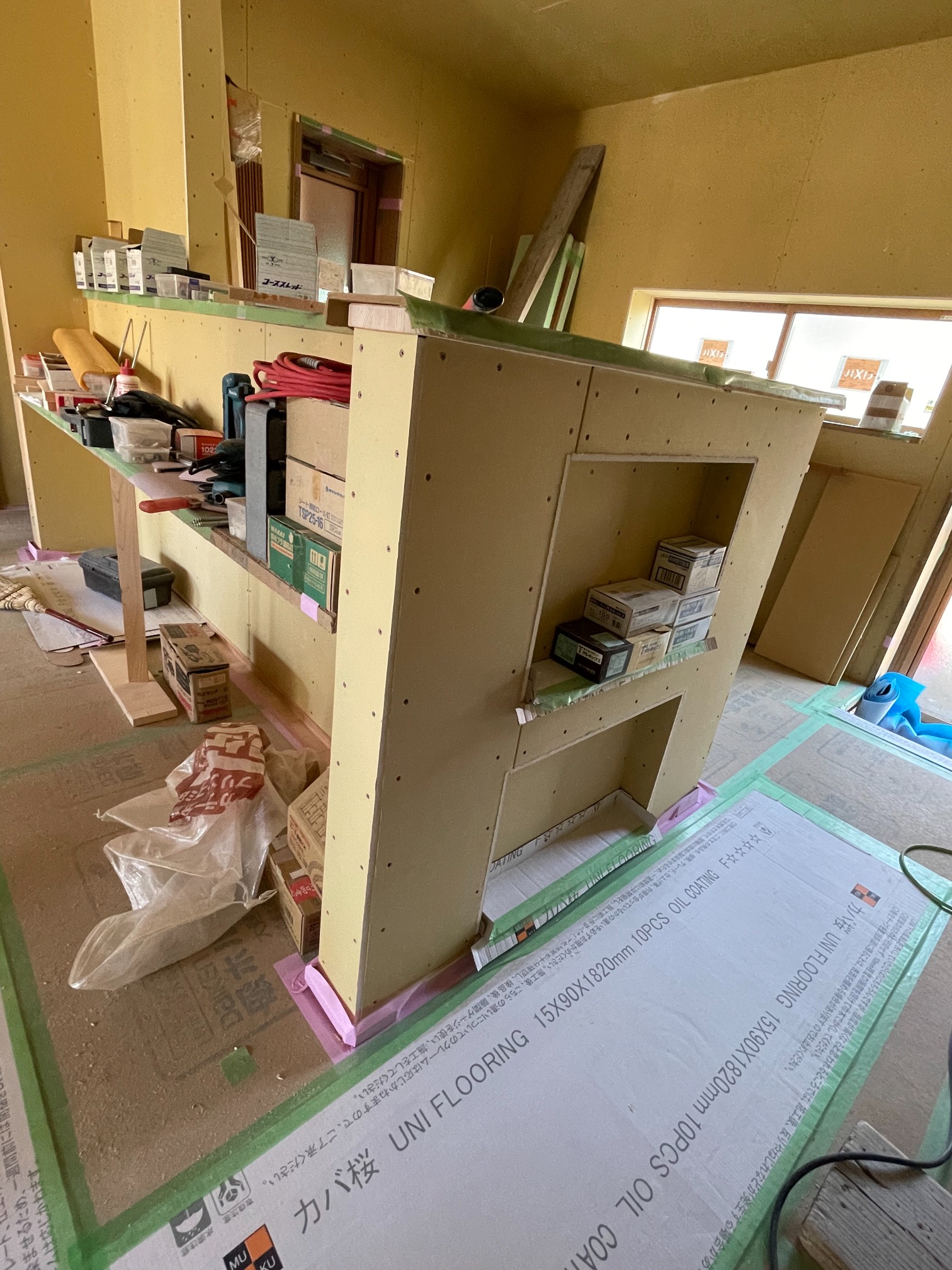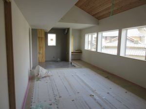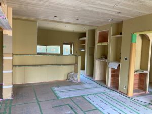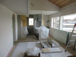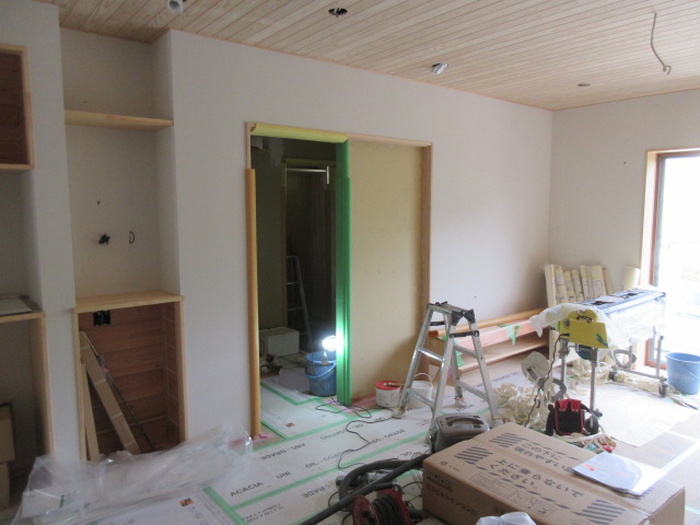 この後はサッシ枠やカウンター塗装、キッチン天井などの左官工事に入ります。