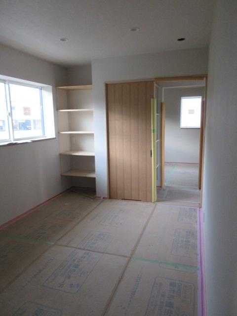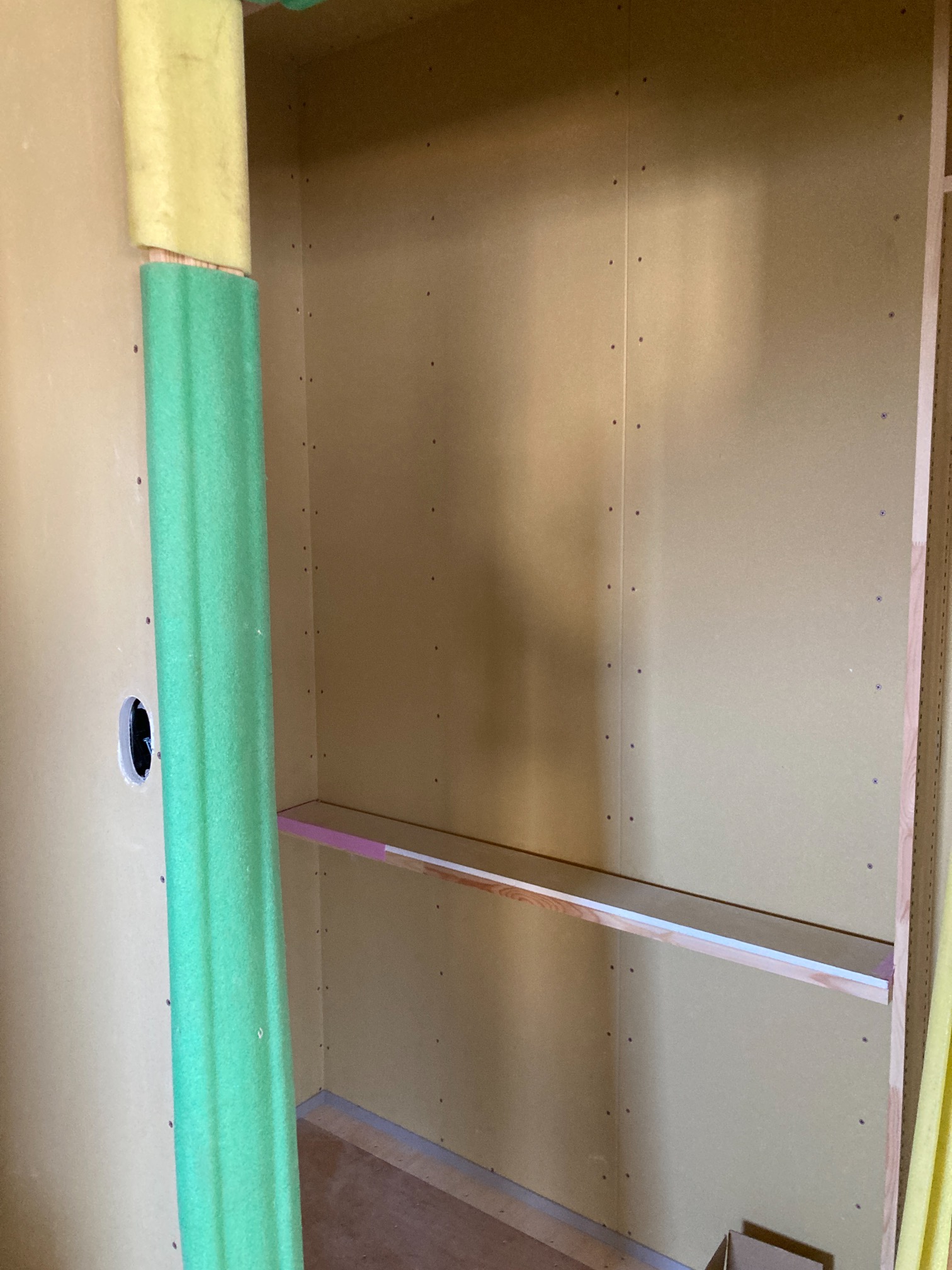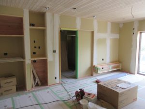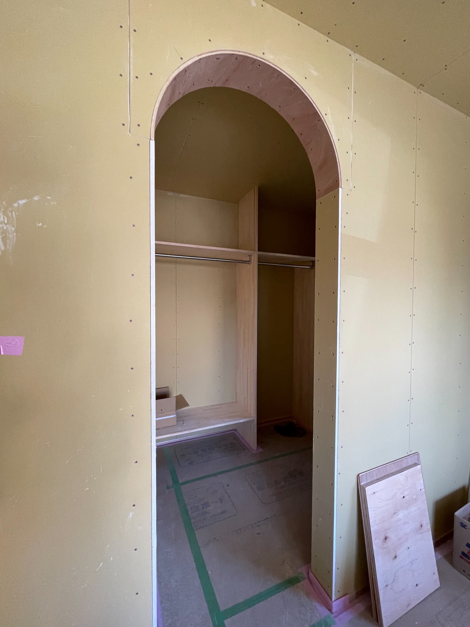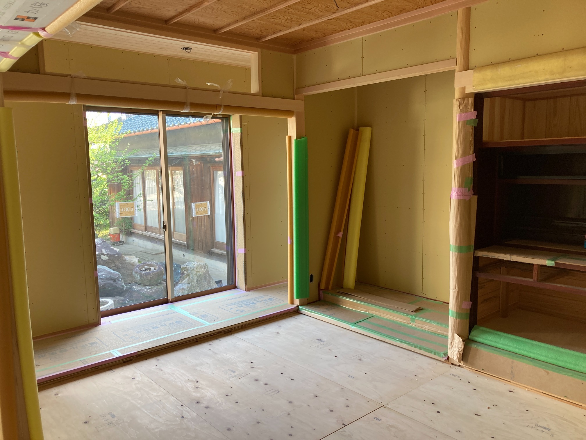 左官工事も並行して進んでいます。まだ下地の段階ですが、和室の仕上げに塗られる珪藻土は調湿効果が高く、においやホルムアルデヒドも吸着・分解してしまう優れものです。
