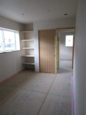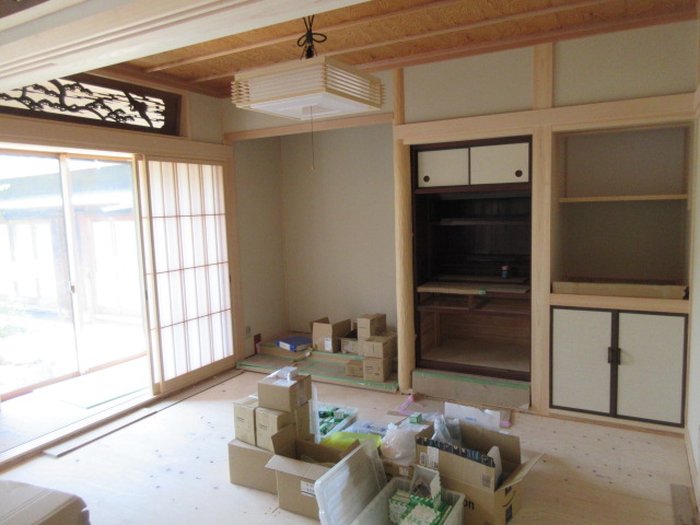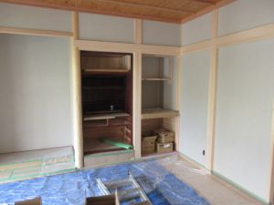 和室の造作が終わり、お手持ち品の仏壇が加工されきれいに収まっています。天井は細い竿縁を支えにして天井板を重ねて張っていくイナゴ天井です。床の間の向きによって張る方向も違います。w辺棟梁が北側の納戸の天井を施工していなかったのは、張り仕舞いを考えてあけていたのですね。木工事はほぼ完了し、残すところ造作TVボードのみとなりました。