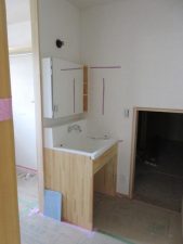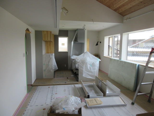 来月のお引き渡しに向け、多くの業者さんが出入りし水回り設備、製作家具や建具が取り付けられています。2階のキッチンも無事設置されました。